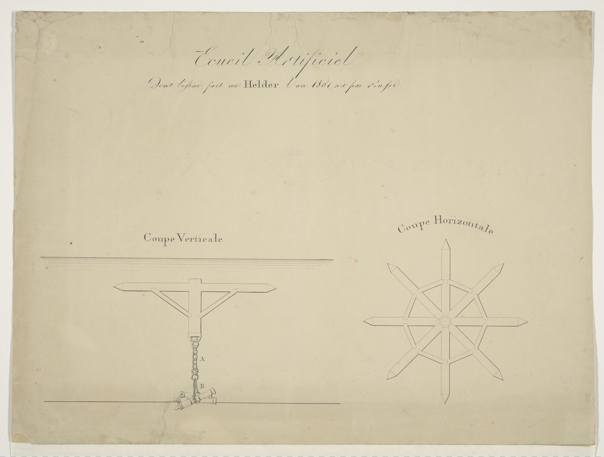 Technische tekening van havenversperring of kunstmatige klip ontworpen door J.P. Asmus [1756 - 1832].
