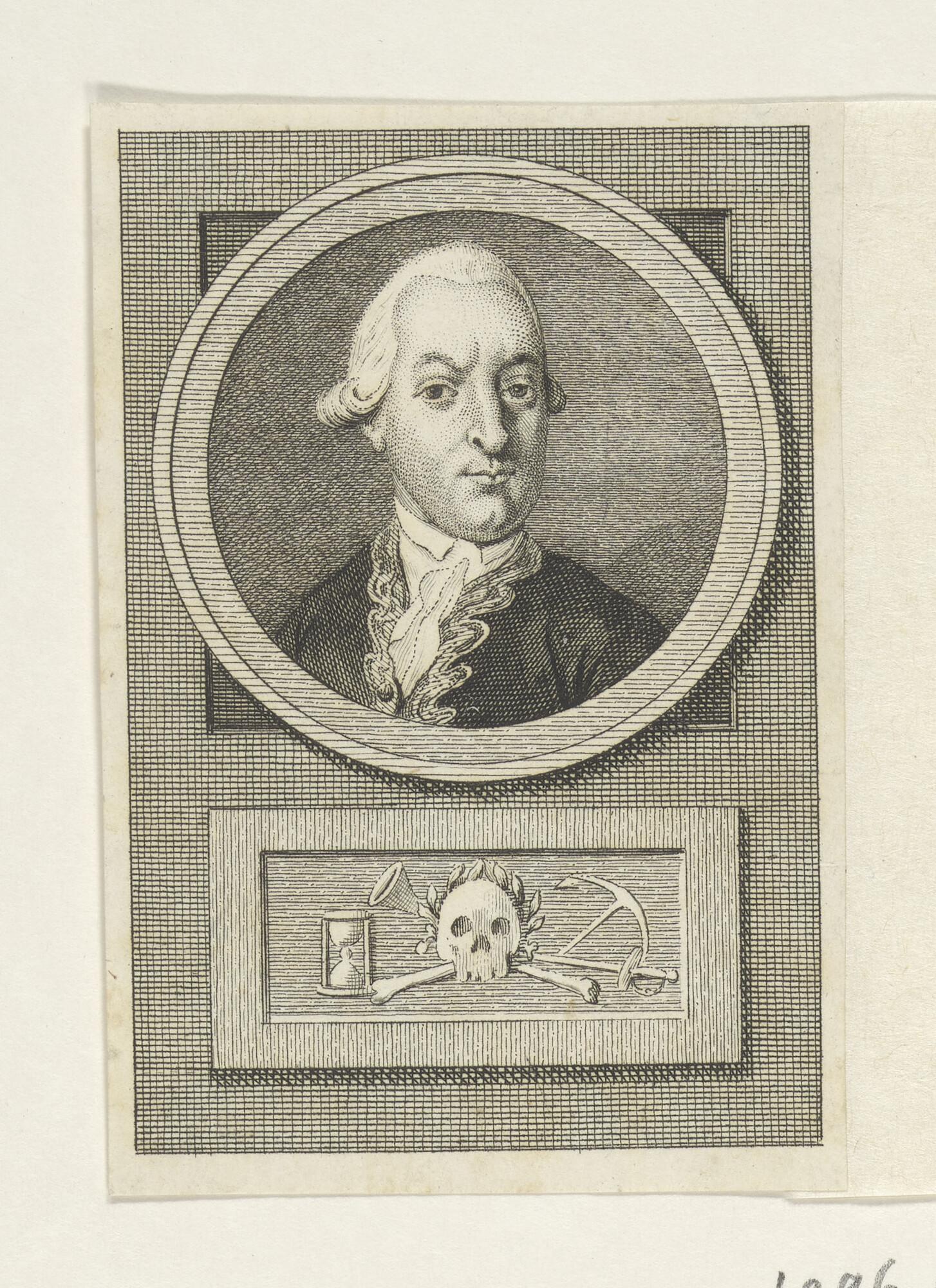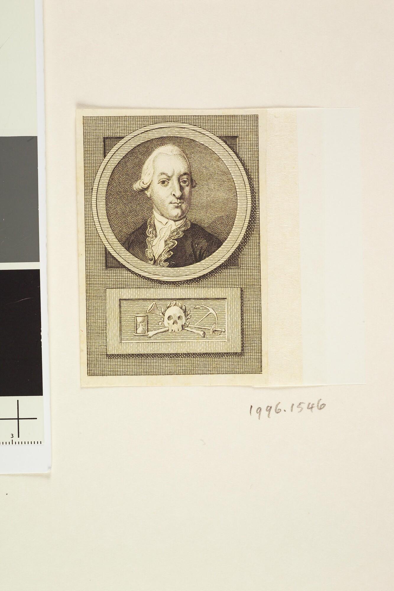 Portret van Wolter Jan Gerrit baron Bentinck, in ovaal, daaronder een schedel, zandloper etc.