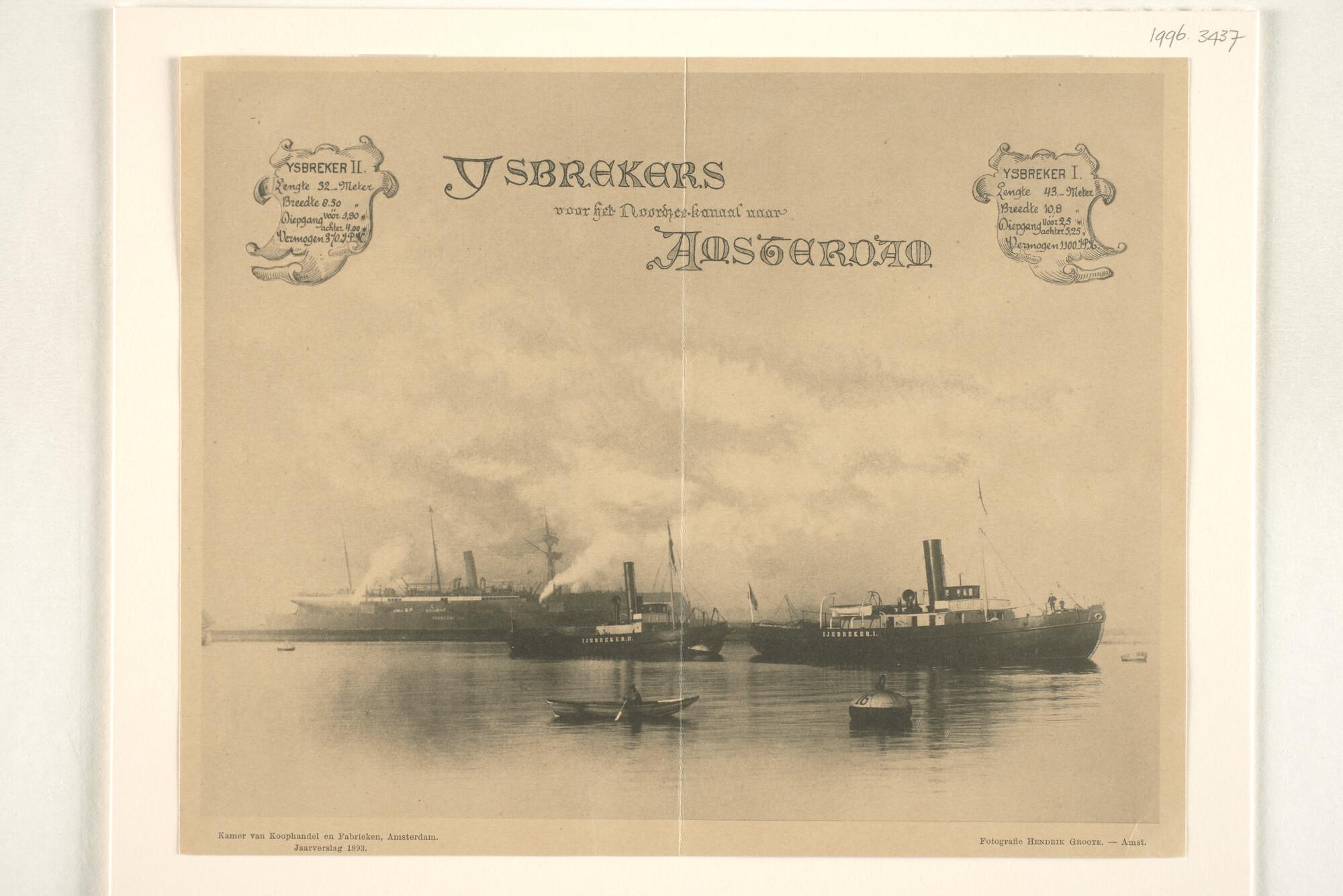 Fotolithografie uit het Jaarverslag van de Kamer van Koophandel Amsterdam, voorstellende de ijsbrekers IJsbreker I en IJsbreker II van de Vereniging Algemene Scheepvaart Belangen op het IJ in Amsterdam.
