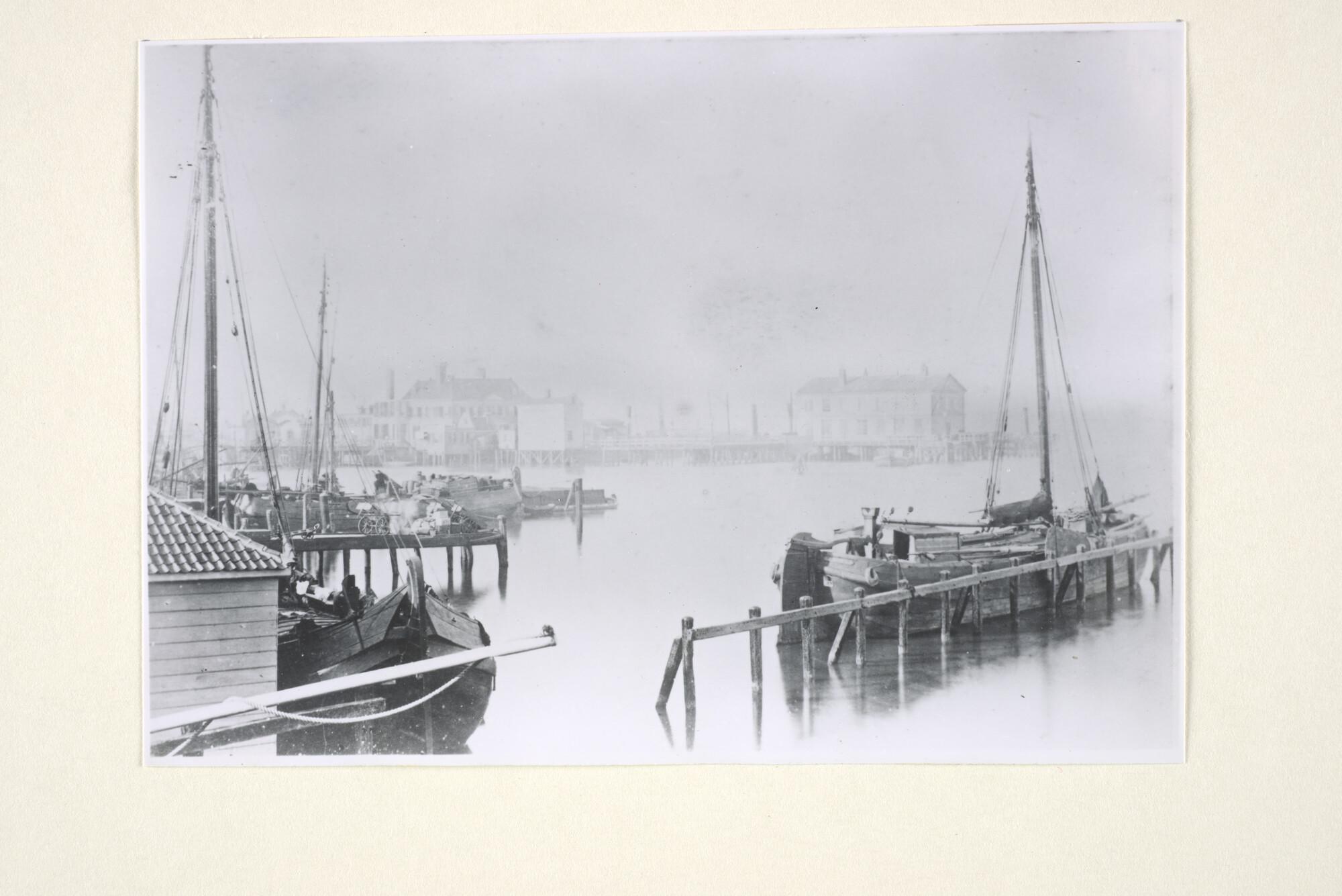 Gezicht op het IJ ter hoogte van het Damrak met ondermeer de oude stadsherberg. Links op de foto ligt een paviljoentjalk afgemeerd.