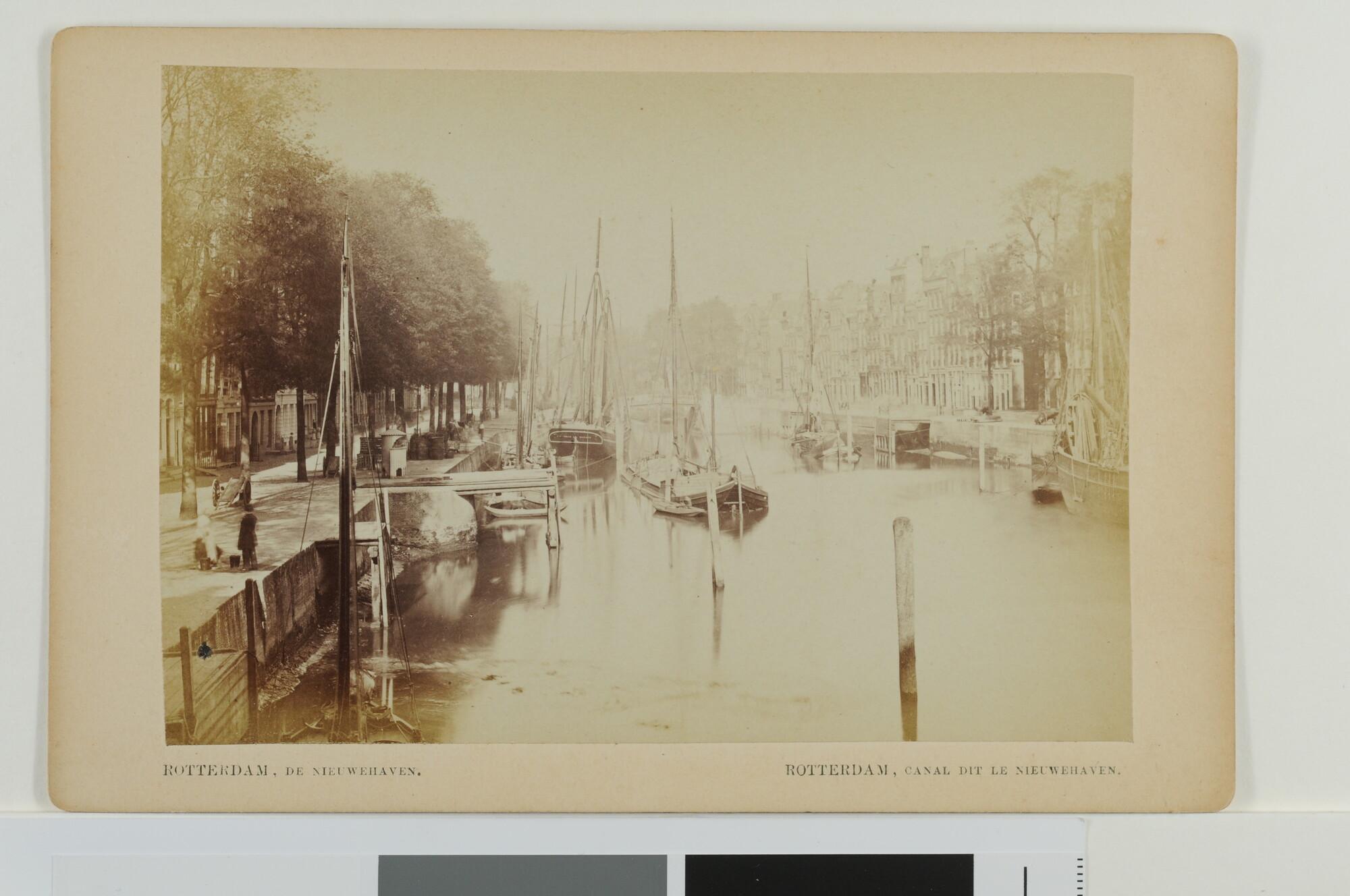 Kabinetfoto. Gezicht op Rotterdam, de Nieuwehaven met afgemeerde binnenvaartschepen.