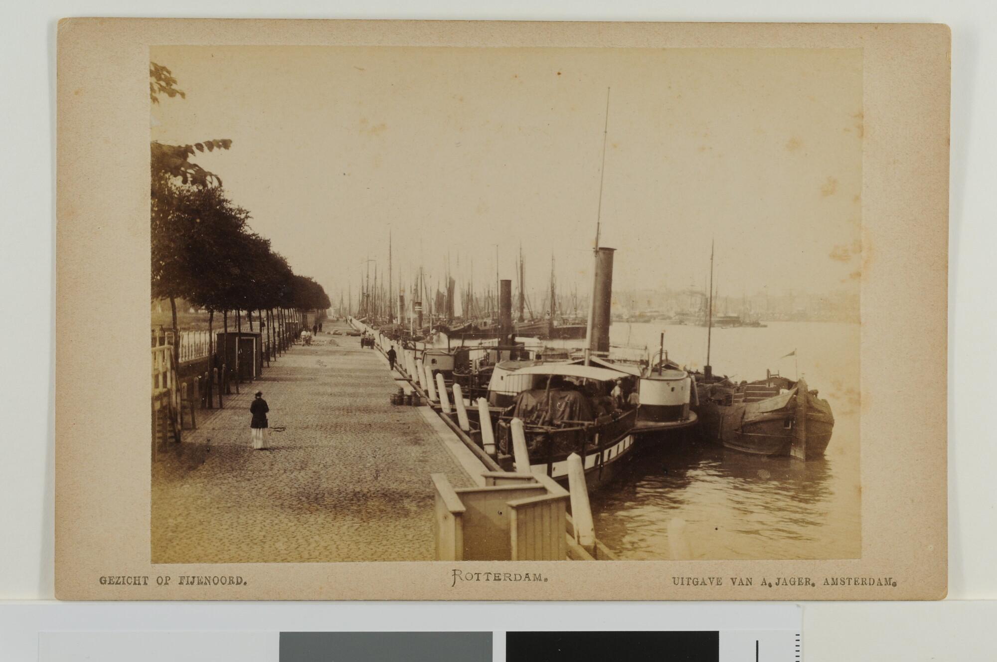 Kabinetfoto. Rotterdam met gezicht op Fijenoord. Op de voorgrond liggen twee raderstoomboten.