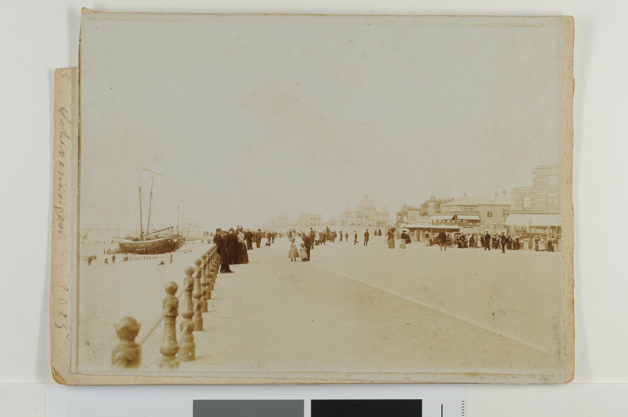 Dagjesmensen op de boulevard in Scheveningen met het Kurhaus en hotel Savoy. Op het strand liggen bomschepen.
