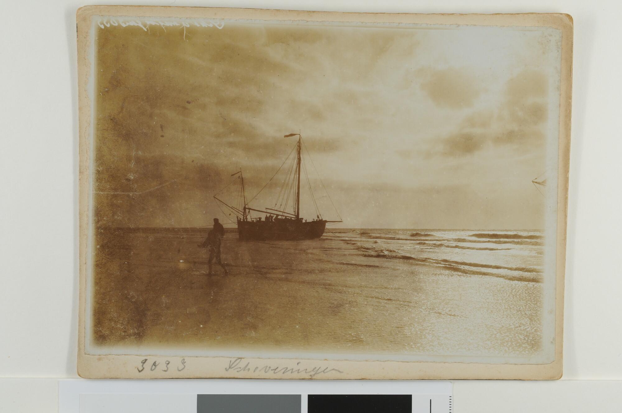Zonsondergang op het strand van Scheveningen. Een bomschuit ligt op het strand, terwijl een man iemand op de schouders van een andere bom naar de wal toe draagt.