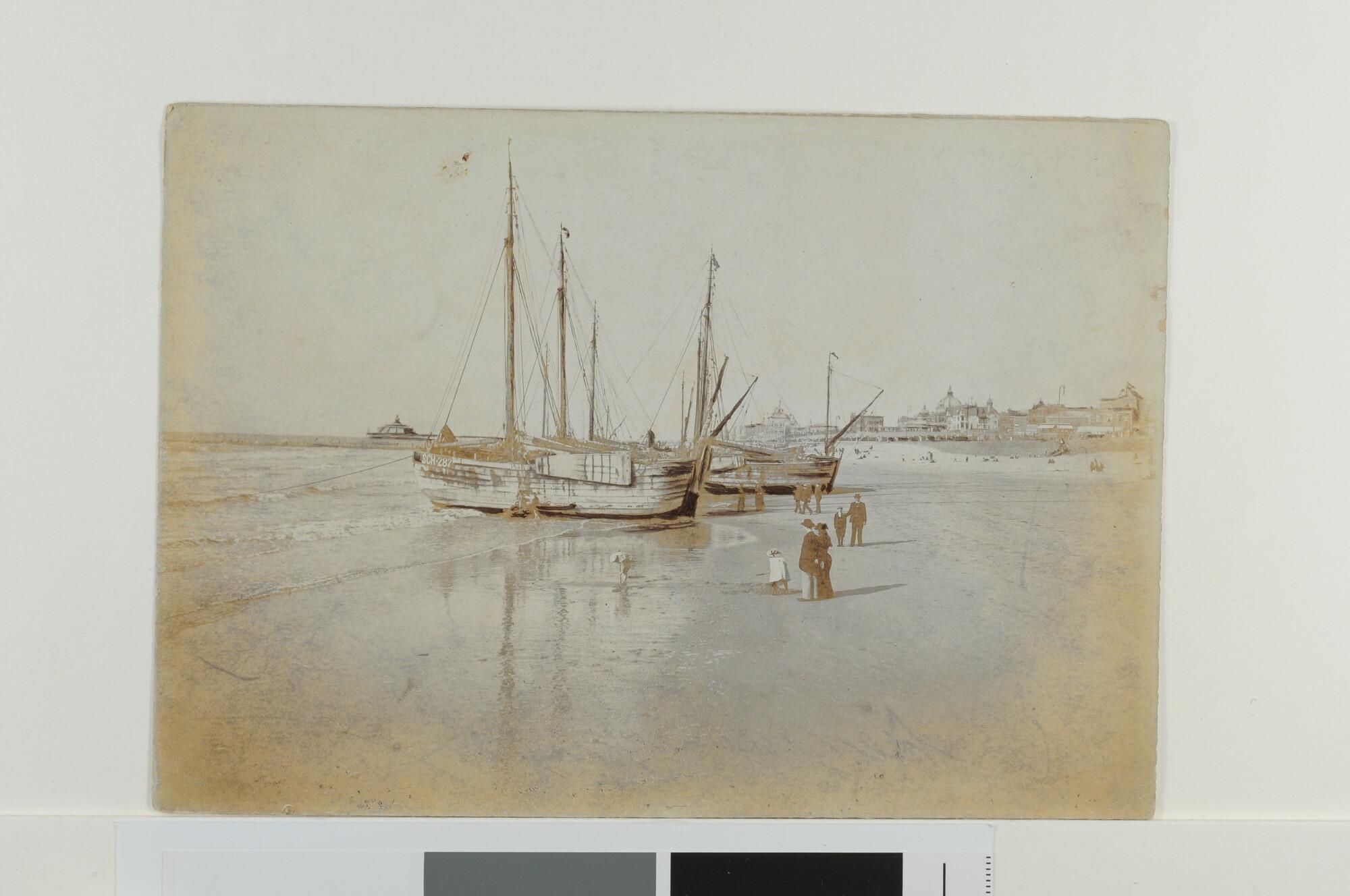 Strandgezicht bij Scheveningen. De bomschuit "SCH 280" ligt op het strand samen met andere bomschepen. Dagjesmensen lopen over het strand, een jongetje en een meisje scheppen in het zand. Op de achtergrond zijn Kurhaus en pier te zien.