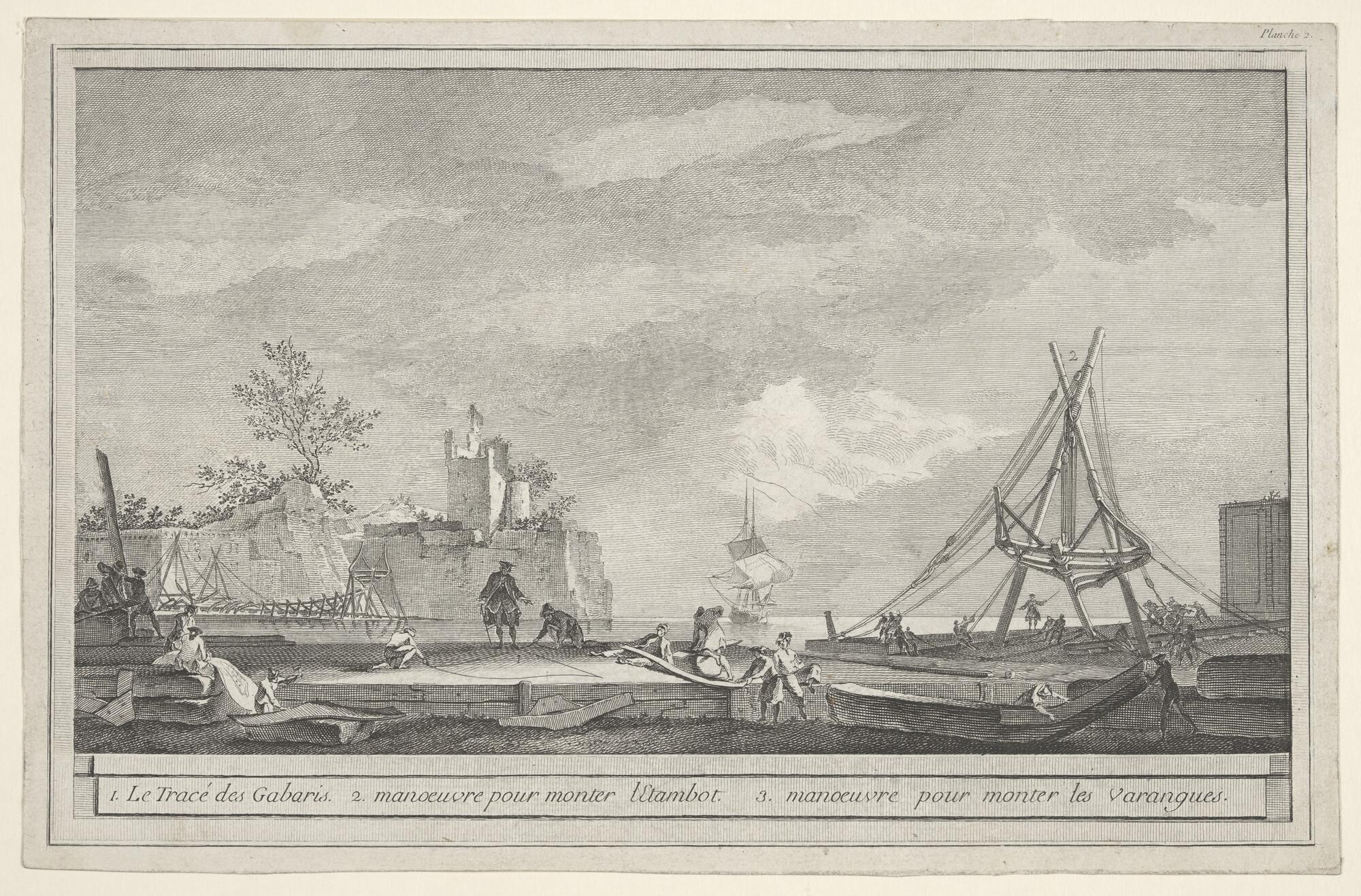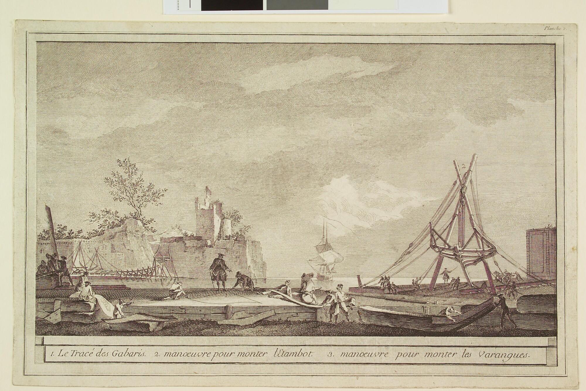 Franse serie met voorstellingen, over de diverse fasen uit de scheepsbouw: fase 1 tot en met 3.