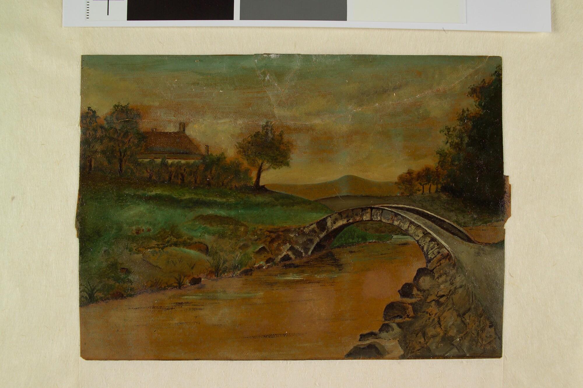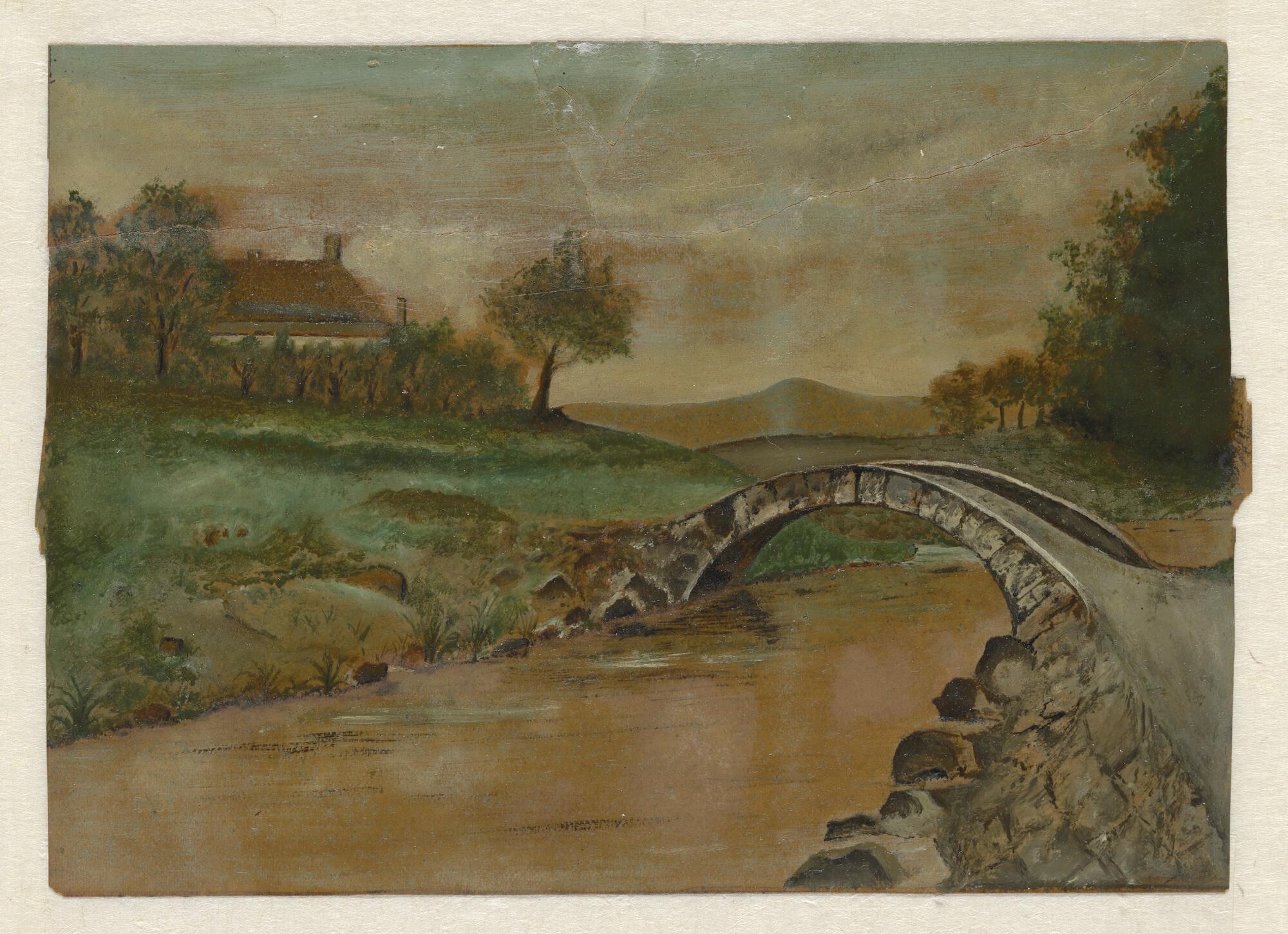 Olieverftekening van een heuvelachtig landschap met rivier waarover een stenen boogbrug.