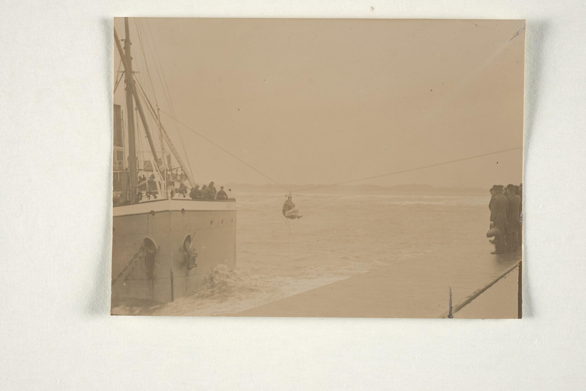 Foto's van het Britse vrachtschip ss. "Obi" van Mercantile SS Co. uit Londen gestrand op de kust bij IJmuiden op 21 september 1897 en de redding van de bemanning met hulp van een reddingbroek.
