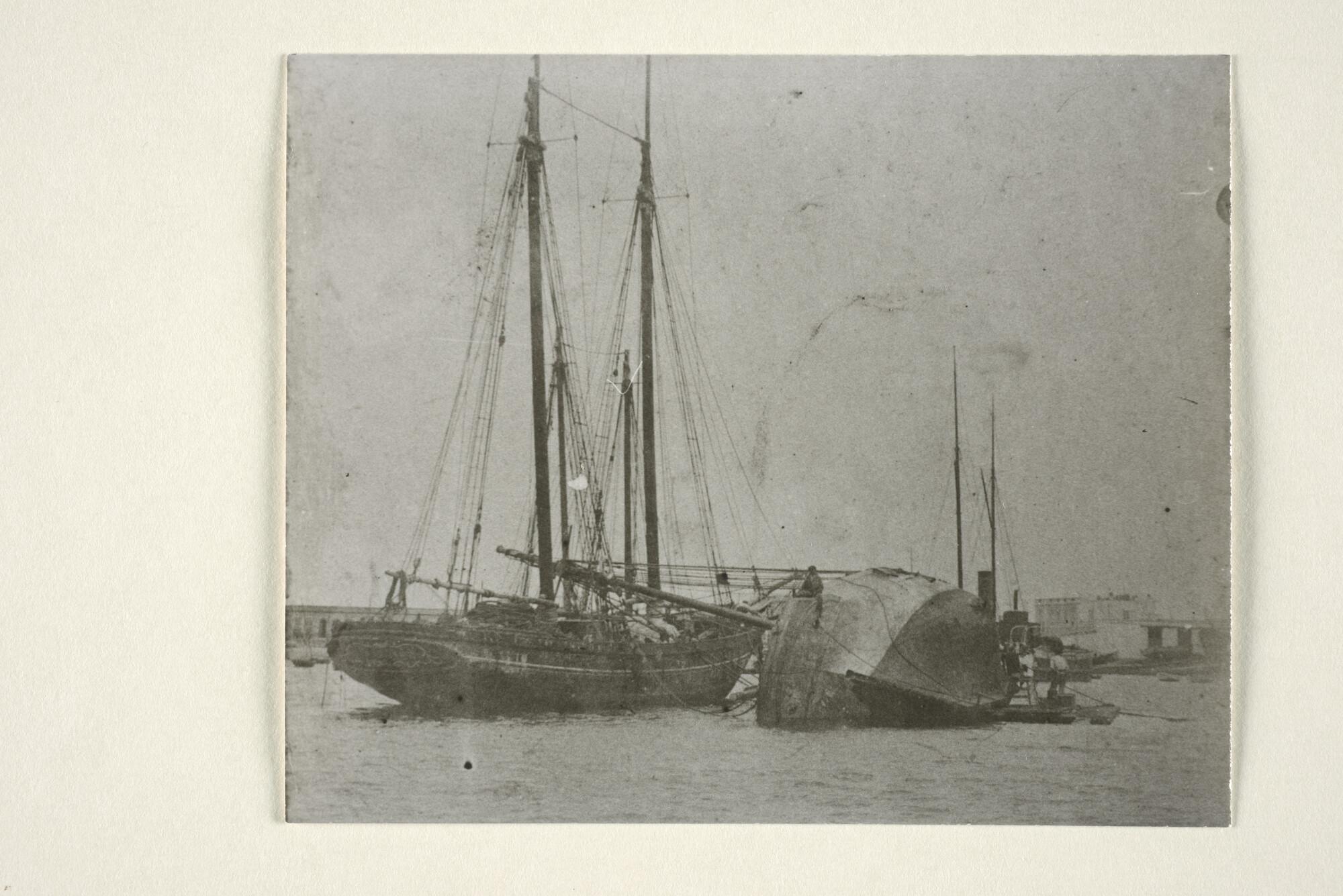 Een (vermoedelijk Britse) schoener ligt gekield, voor werkzaamheden onder de waterlijn, naast een andere schoener. [Reproductiefoto]
