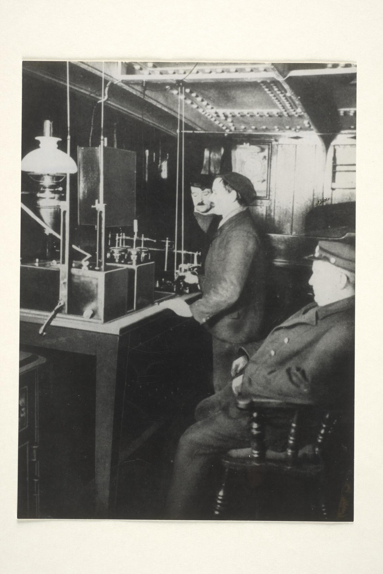 Interieurfoto genomen aan boord van het Britse lichtschip "East Goodwin": een marconist is bezig met de bediening van de morsesleutel. [Reproductiefoto]