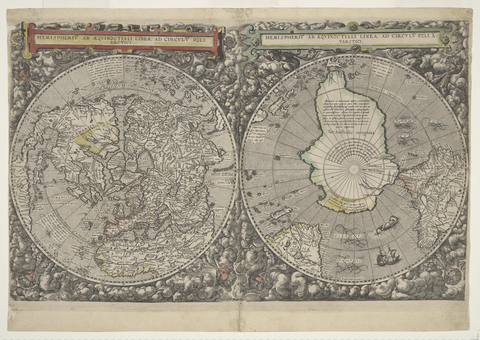 Met de hand gekleurde wereldkaart in 2 halfronden, uit Speculum Orbis Terrarum van Cornelis de Jode (1568 - 1600), Antwerpen, 1593.