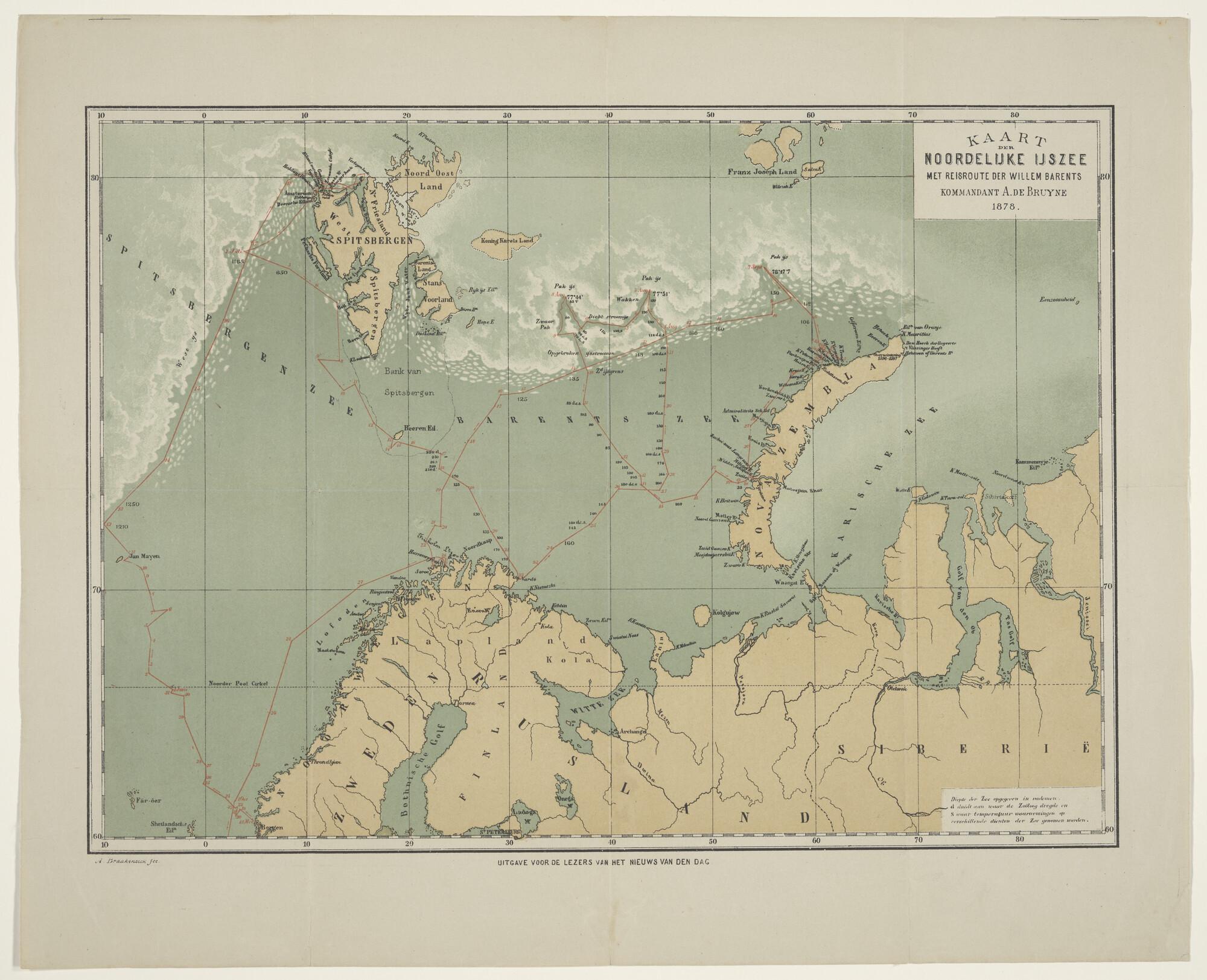 Kaart van de Noordelijke IJszee met de reisroute van de Nederlandse poolschoener "Willem Barents" in 1878. Gekleurde lithografie door A. Braakensiek, uitgave Het Nieuws voor den Dag, Amsterdam, 1879.