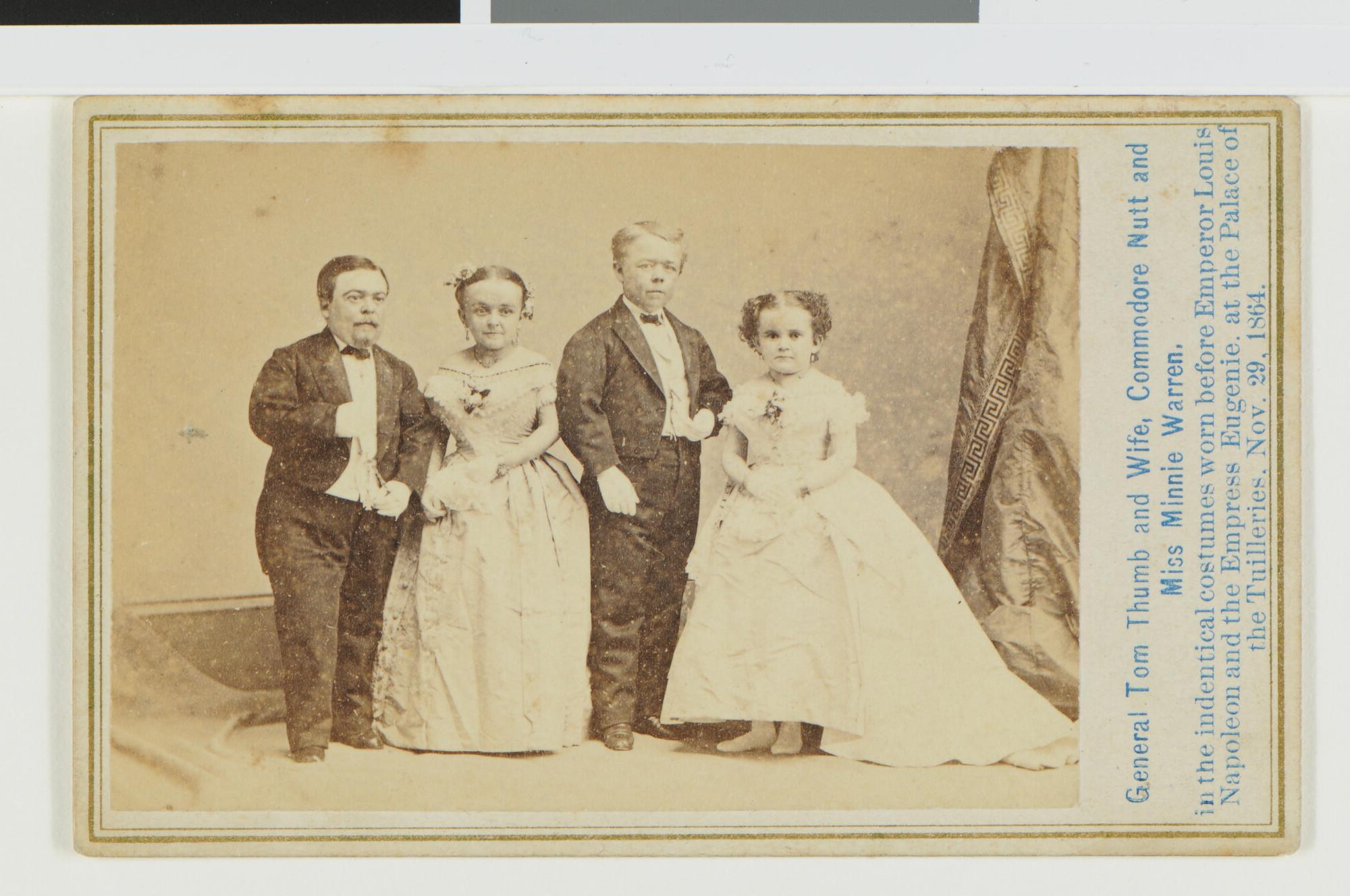 Groepsportret van Charles S. Stratton, Savina Warren Stratton (General Tom Thumb and wife), G. W. McNutt (Commodore Nutt) and miss Minnie Warren.