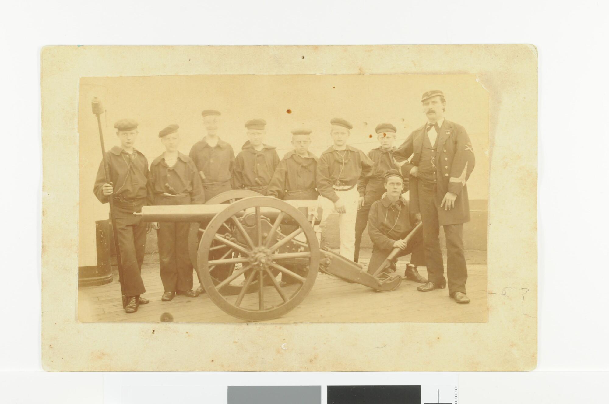 Groepsportret van een groep jongens met hun instructuur poserent voor een 7.5 cm