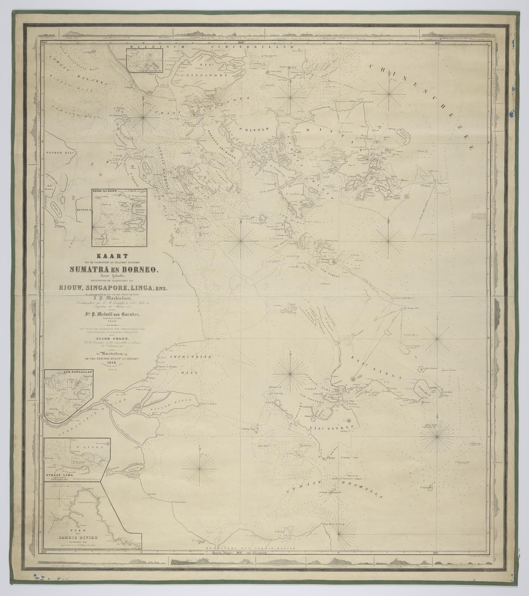 Kaart van de vaarwaters en eilanden tussen Sumatra en Borneo, Eerste gedeelte, door jhr P. Melvill van Carnbee, 1843. Tek G.A. Gunther, grav. D. Veelwaard jr, uitg Jacob Swart, Wed. G. Hulst van Keulen, Amsterdam, 1845, verb 1847. Lengte volgens Greenwich (schaal 1 op 250.000).