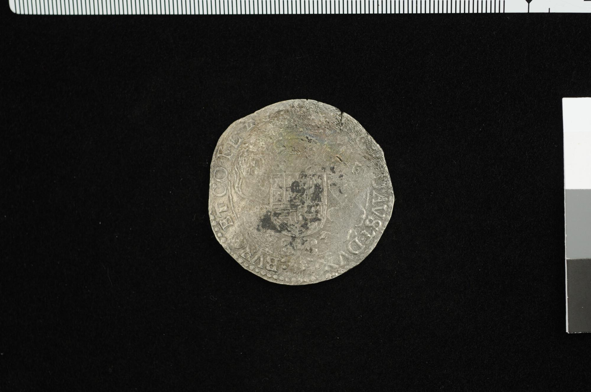 Zilveren dukaton van Filips IV, koning van Spanje, geslagen voor het graafschap Vlaanderen, munt uit het wrak van de Oostindiëvaarder "Hollandia", 1634.