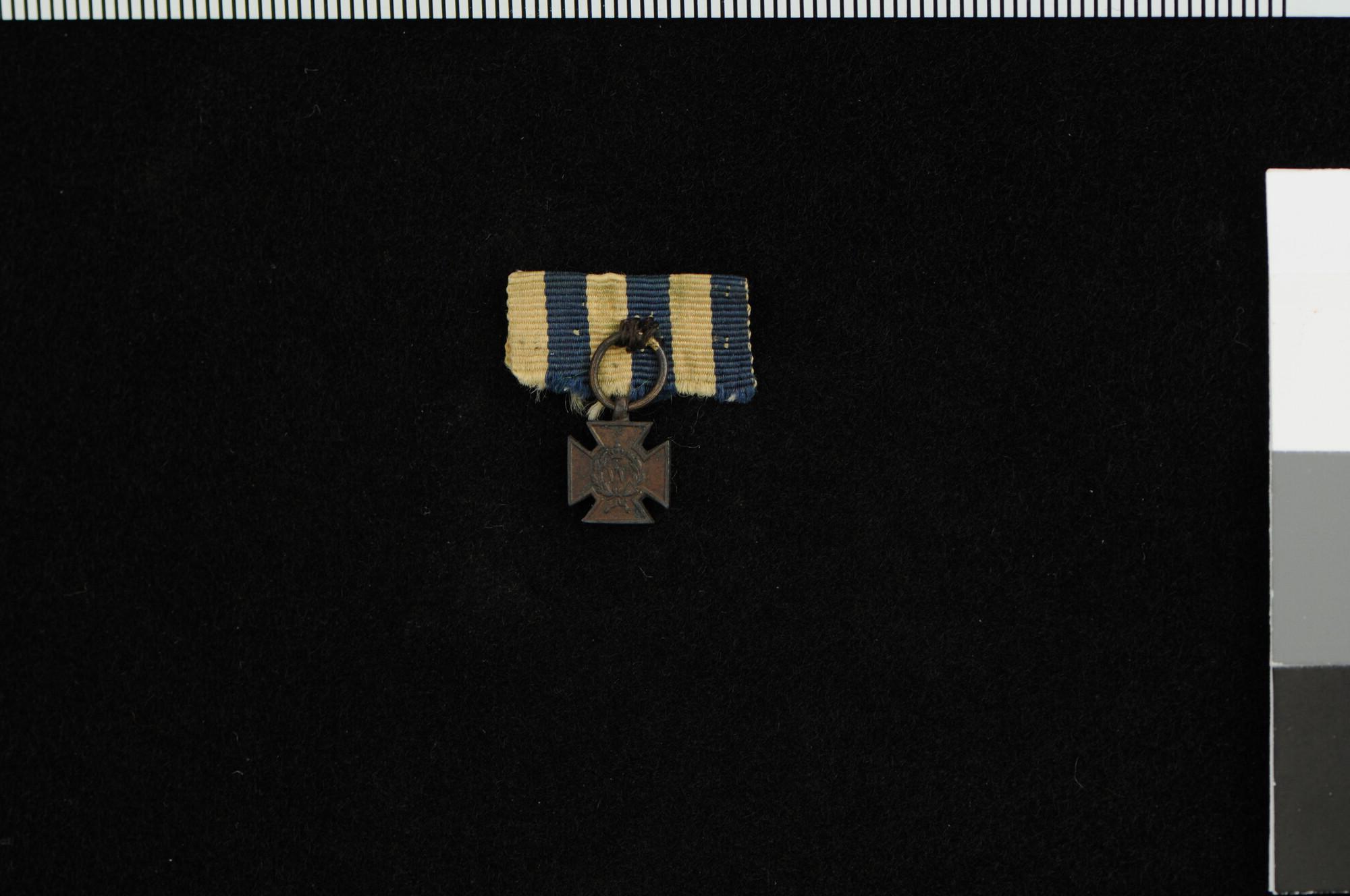 Miniatuur Metalen Kruis 1830-1831 aan klein stuk oranjeblauw lint. Toegekend als ereteken voor deelname aan de gevechten tijdens de Belgische Revolutie. De medaille staat ook bekend als Hasseltkruis, naar verluid werden deze medailles vervaardigd van brons van tijdens de Slag bij Hasselt buitgemaakte kanonnen. Dit wordt betwist.