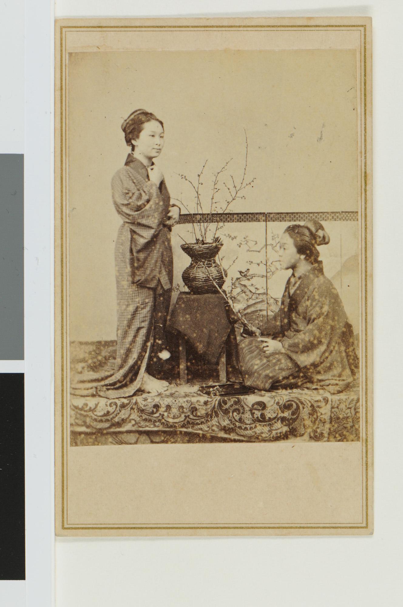 Groepsportret van twee vrouwen bezig met bloemschikken