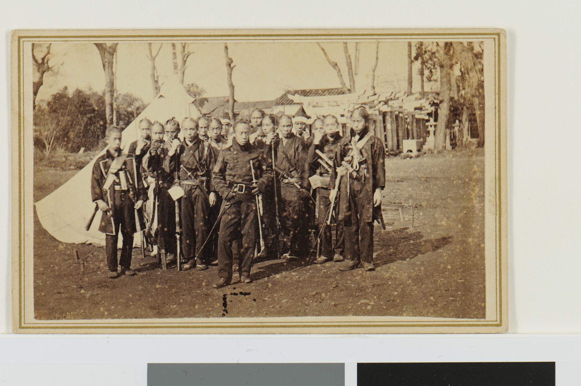 Groepsportret van soldaten voor een tent