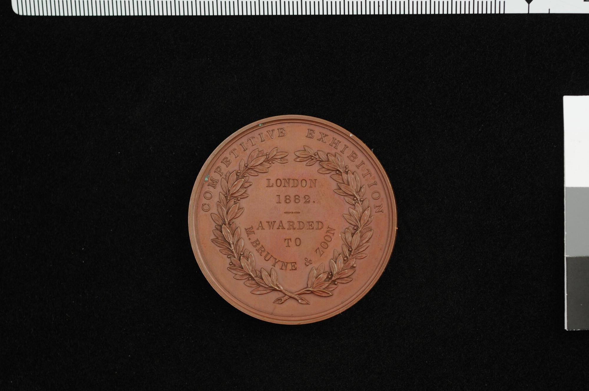 Engelse prijspenning van de Worshipful Company of Shipwrights, uitgereikt op de Competitive Exhibition te Londen aan M. Bruyne en Zoon, 1882.