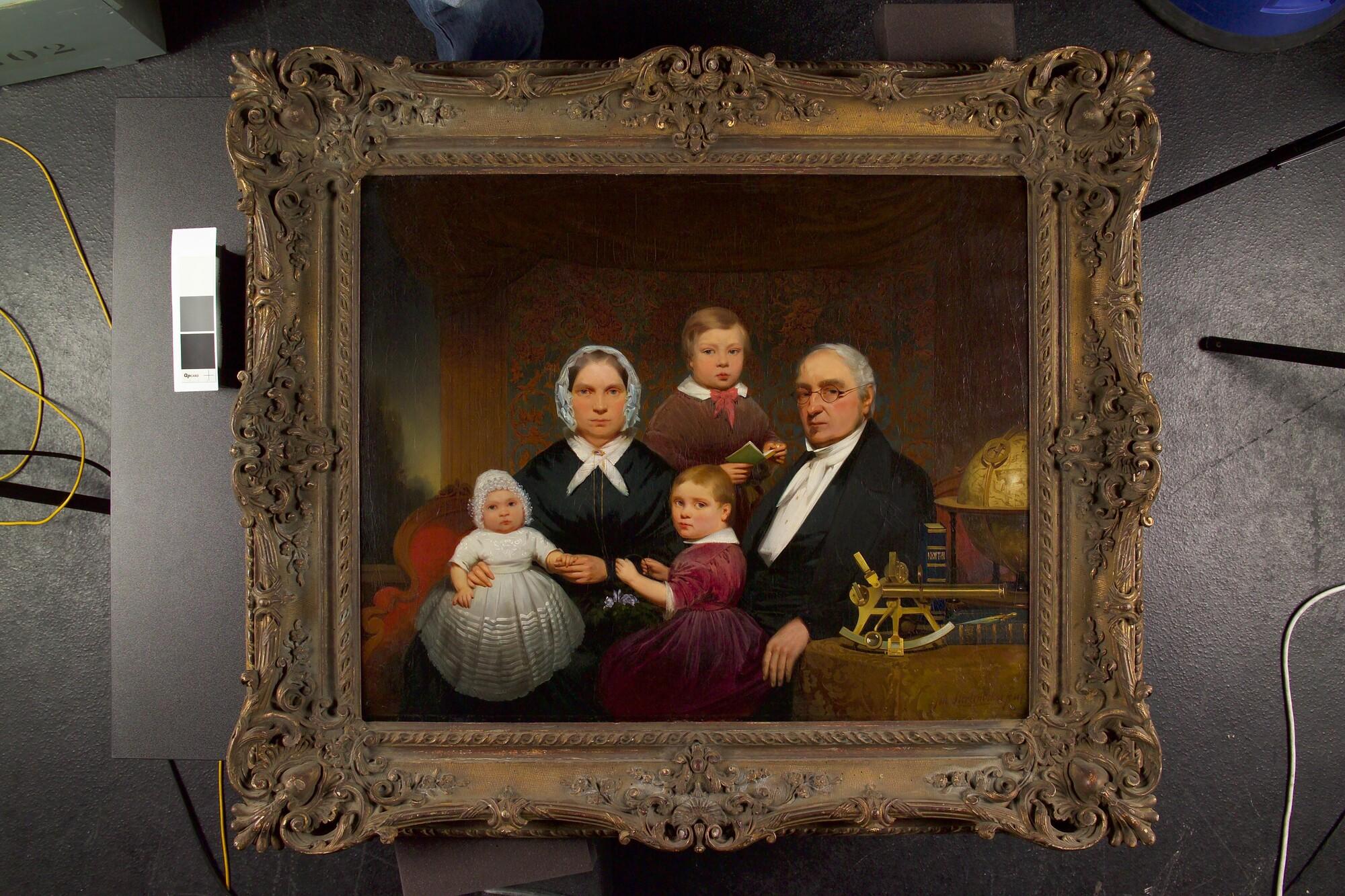 Familieportret met quintant, hemelglobe, passer en natuurwetenschappelijke literatuur. Wellicht Jacob Swart, eigenaar van de Fa. Wed. G. Hulst van Keulen, te Amsterdam.