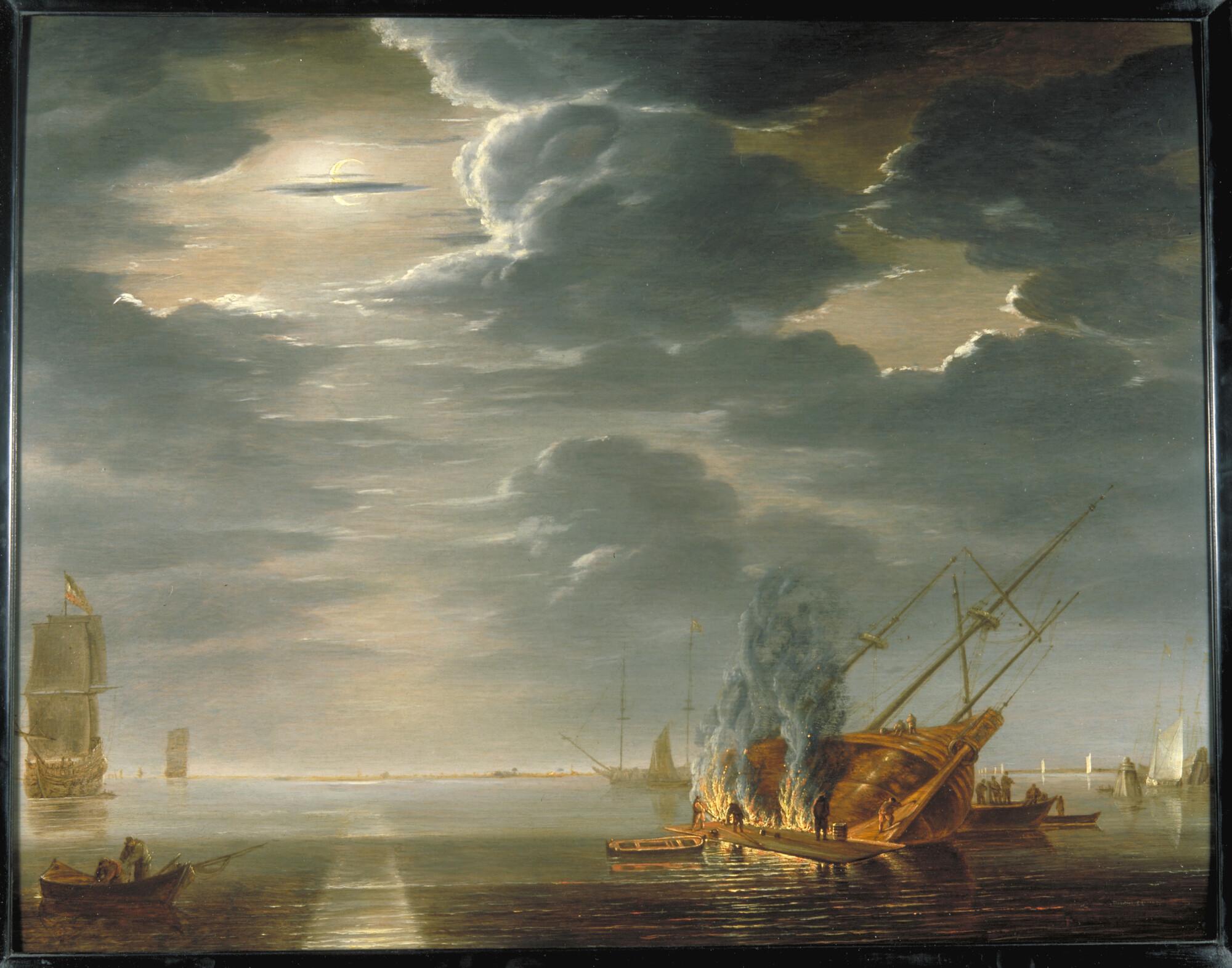 Het afbranden van de scheepshuid van een gekrengd fluitschip. In lijst.