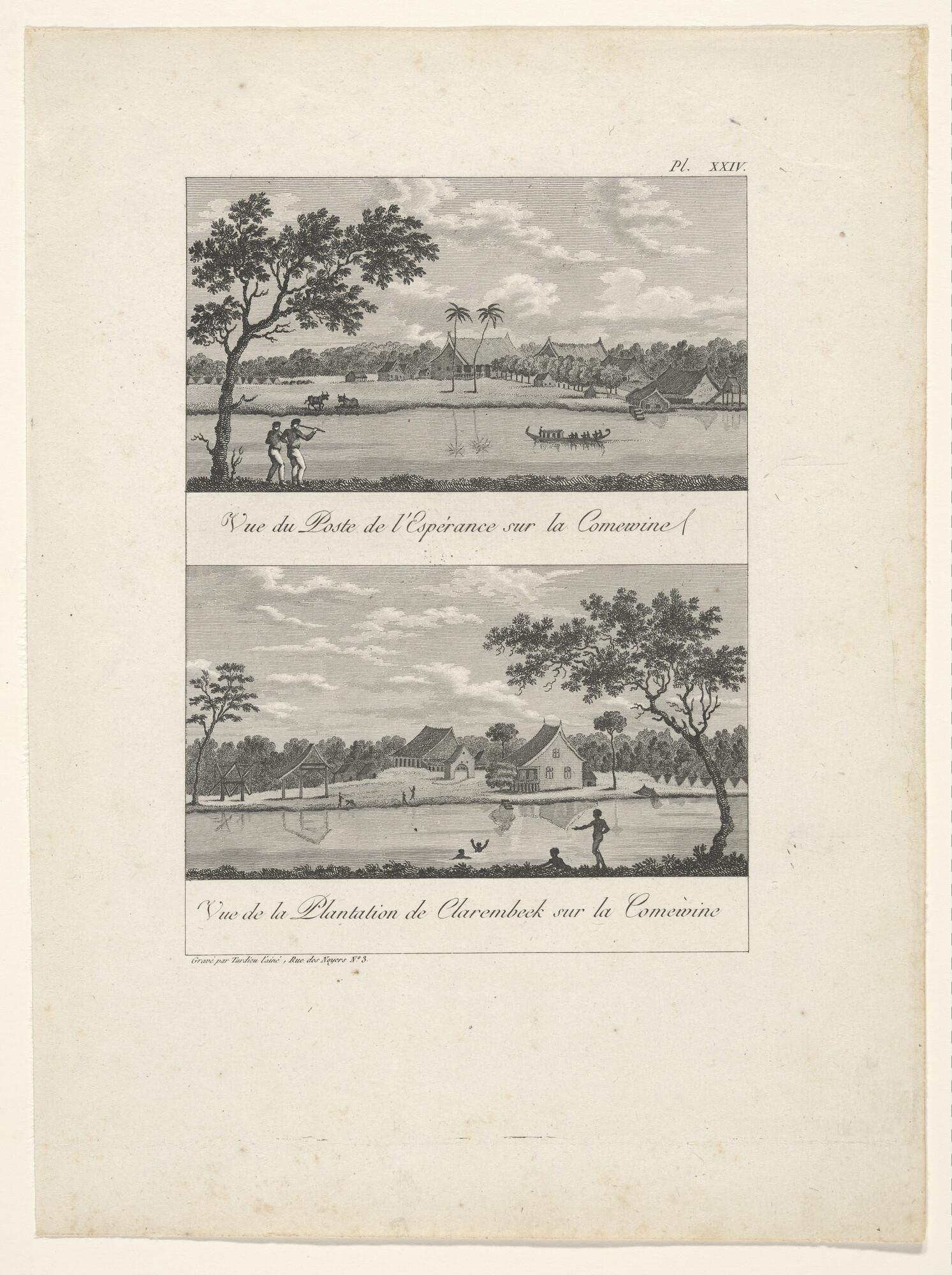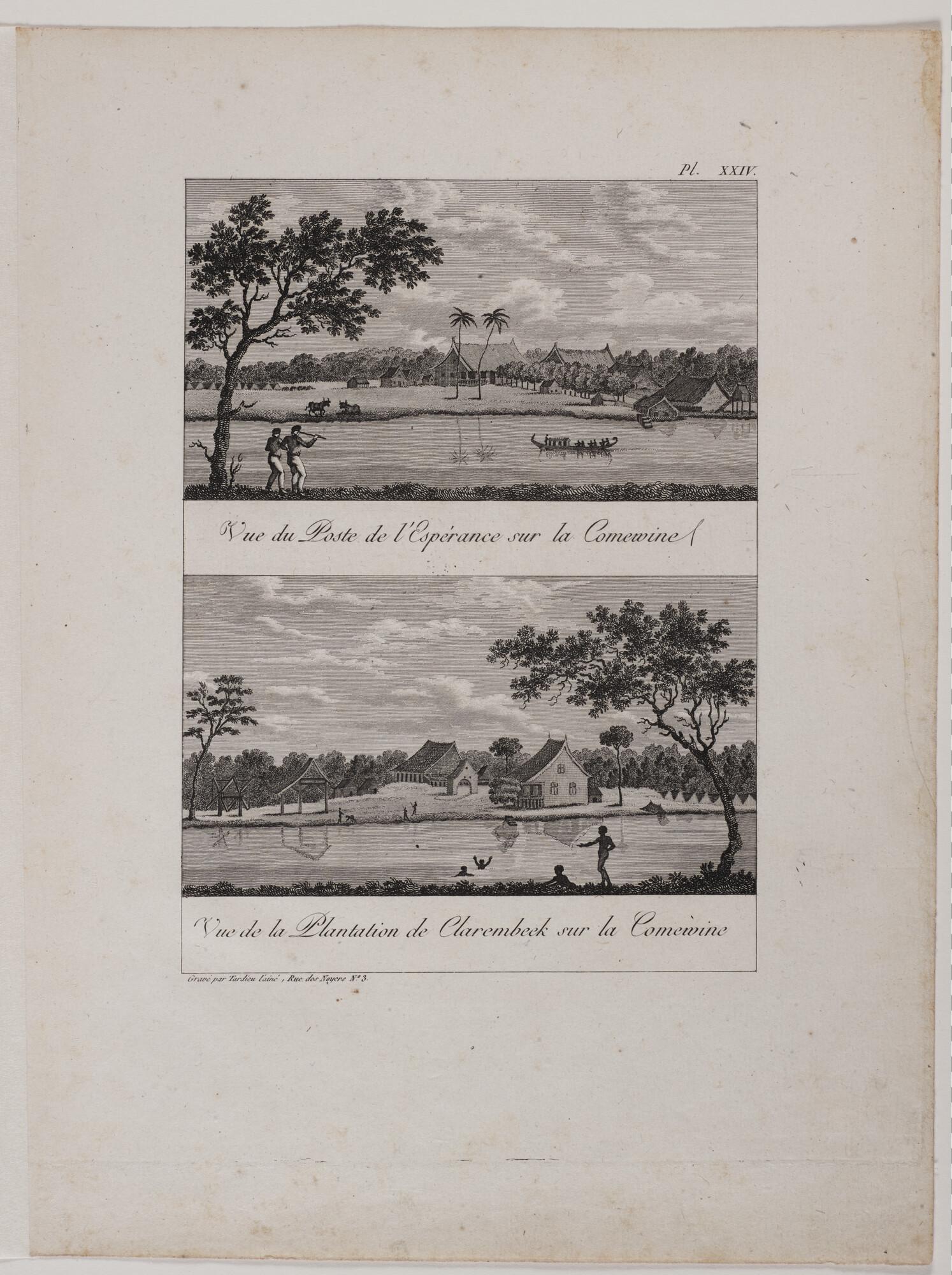 Gravure (plaat XXIV) uit de Franse editie van J.G. Stedman's 'Reize naar Surinamen' (1799-1800): twee afbeeldingen van nederzettingen aan de rivier de Commewijne.