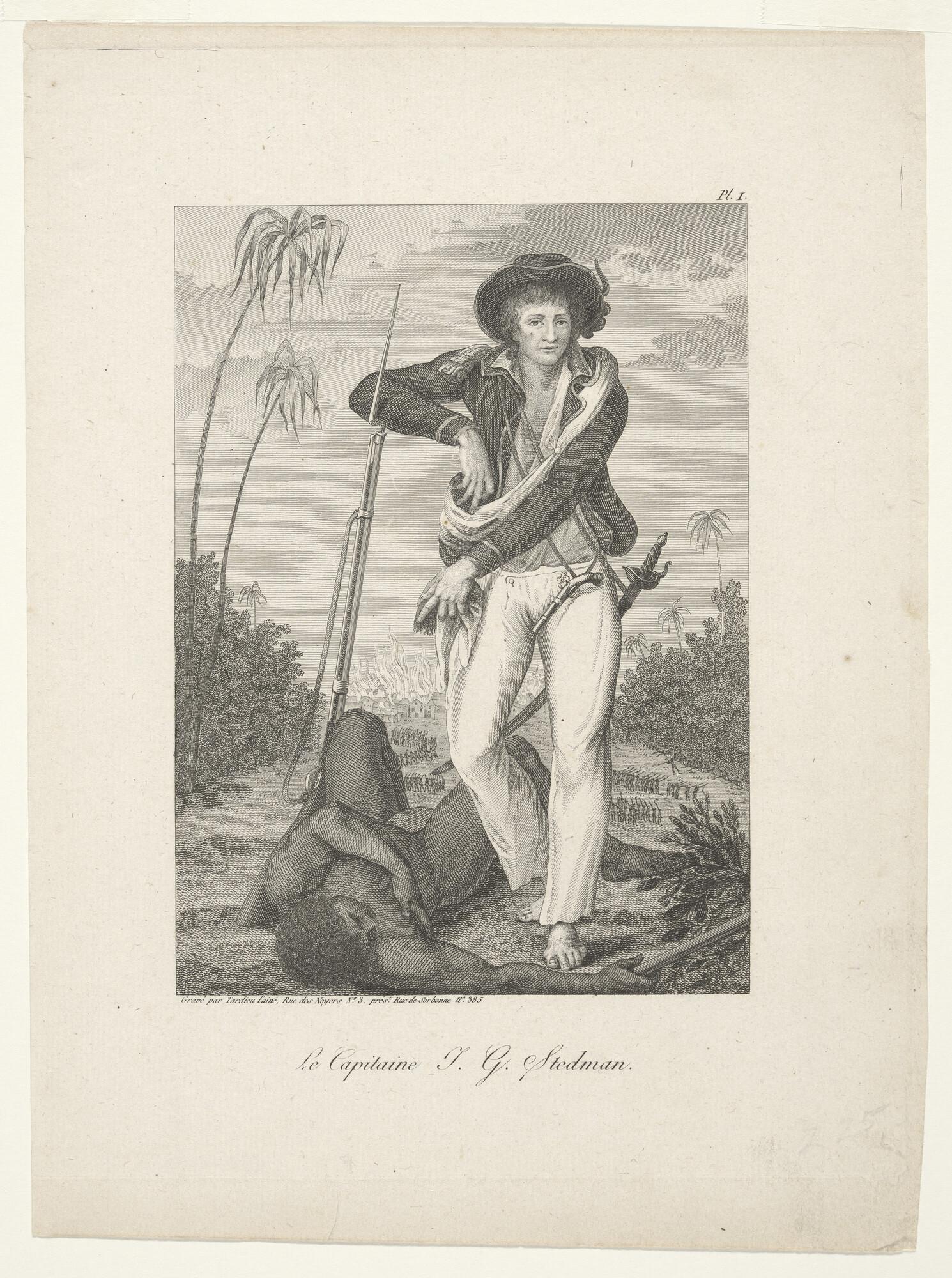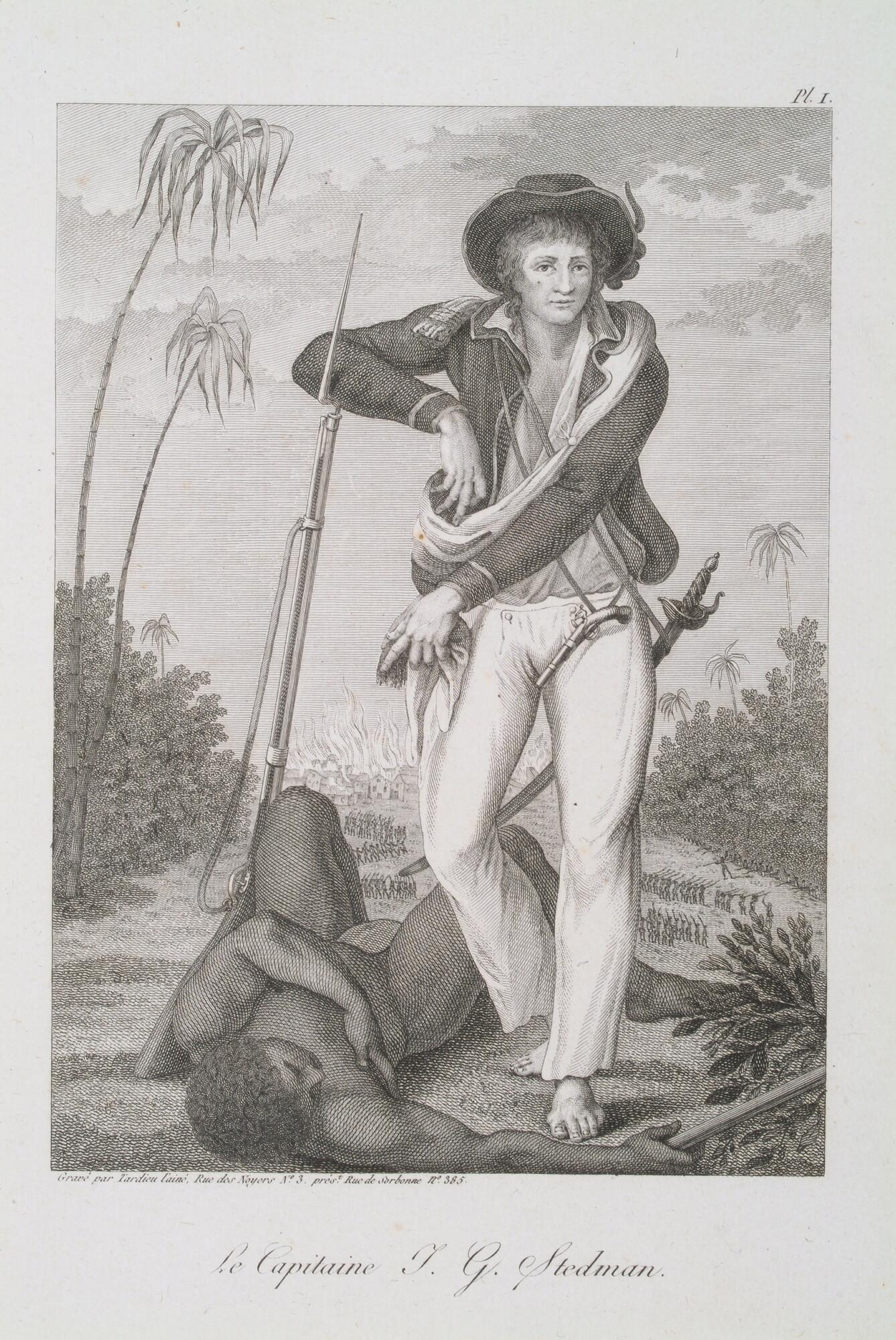 Gravure (plaat 1) uit de Franse editie van J.G. Stedman's 'Reize naar Surinamen' (1799 - 1800): Portret van kapitein J.G. Stedman, met een gedode zwarte man aan zijn voeten.