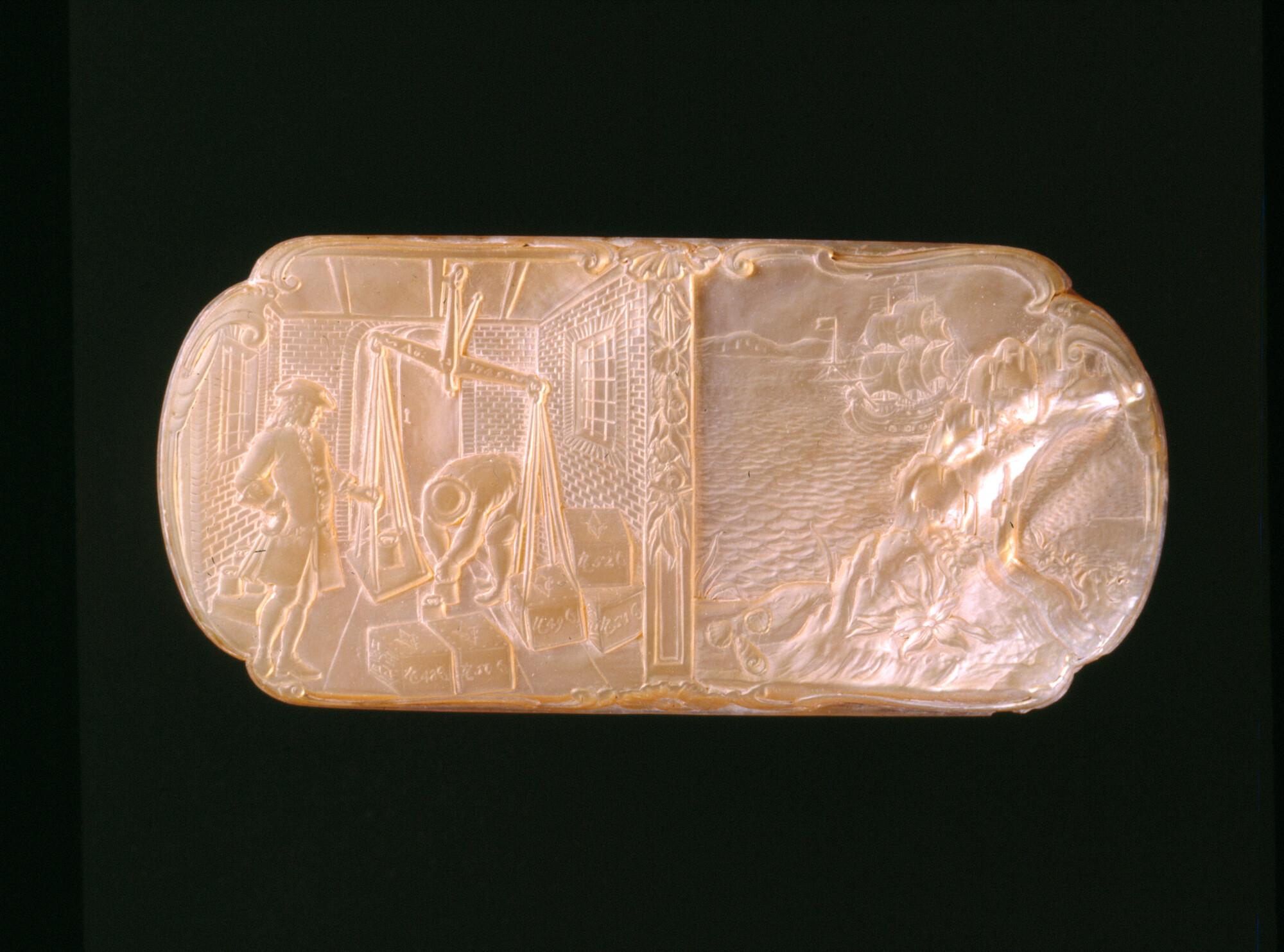 Langwerpig parelmoeren deksel met twee gesneden voorstellingen van de VOC-handel in Azië. Op de voorstelling aan de linkerzijde kijkt een Europees geklede koopman in een pakhuis toe hoe een arbeider op een waag kisten weegt die zijn voorzien van het monogram van de Amsterdamse kamer van de VOC en verschillende gewichtsmarkeringen. Op de rechterhelft vaart ...