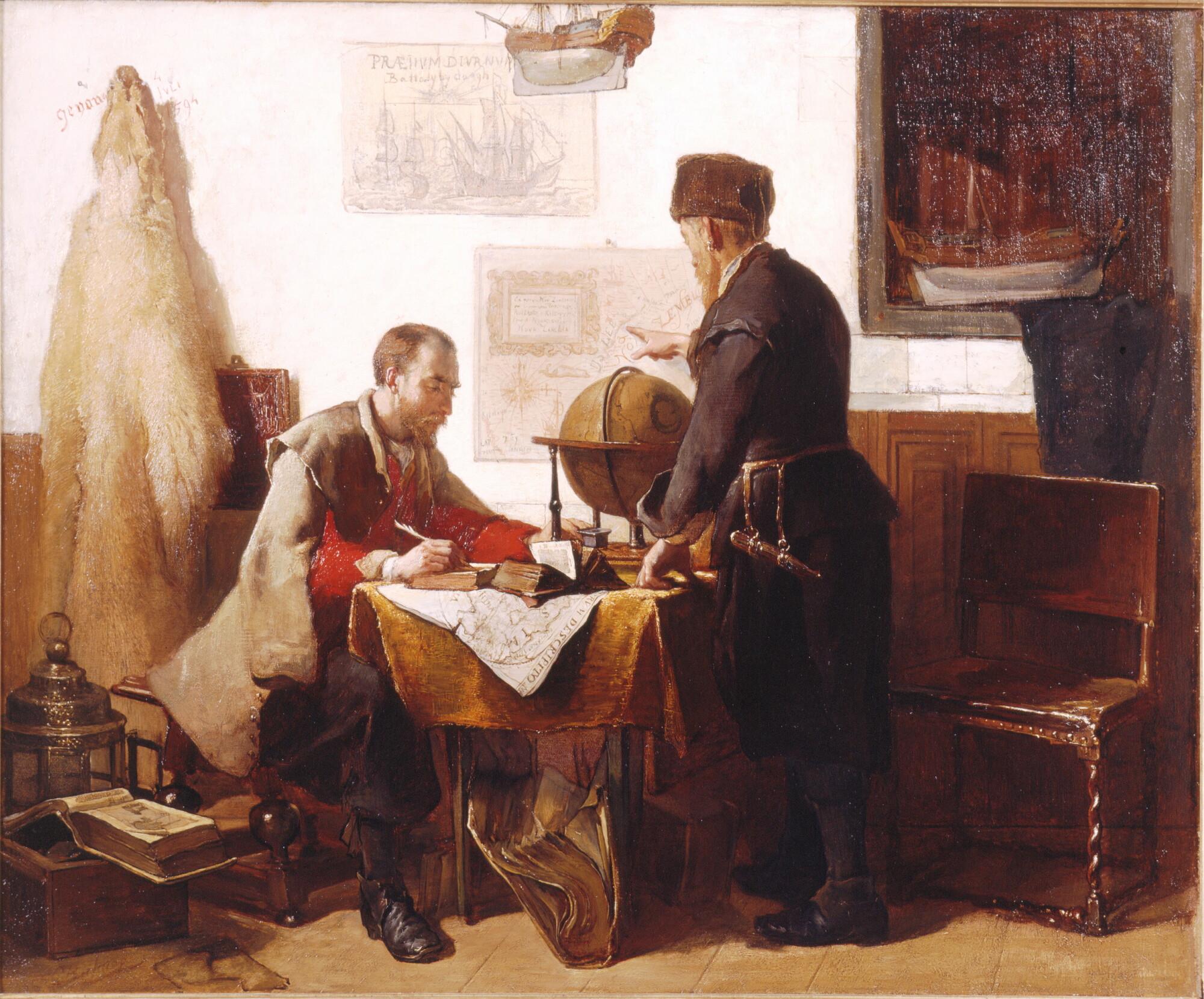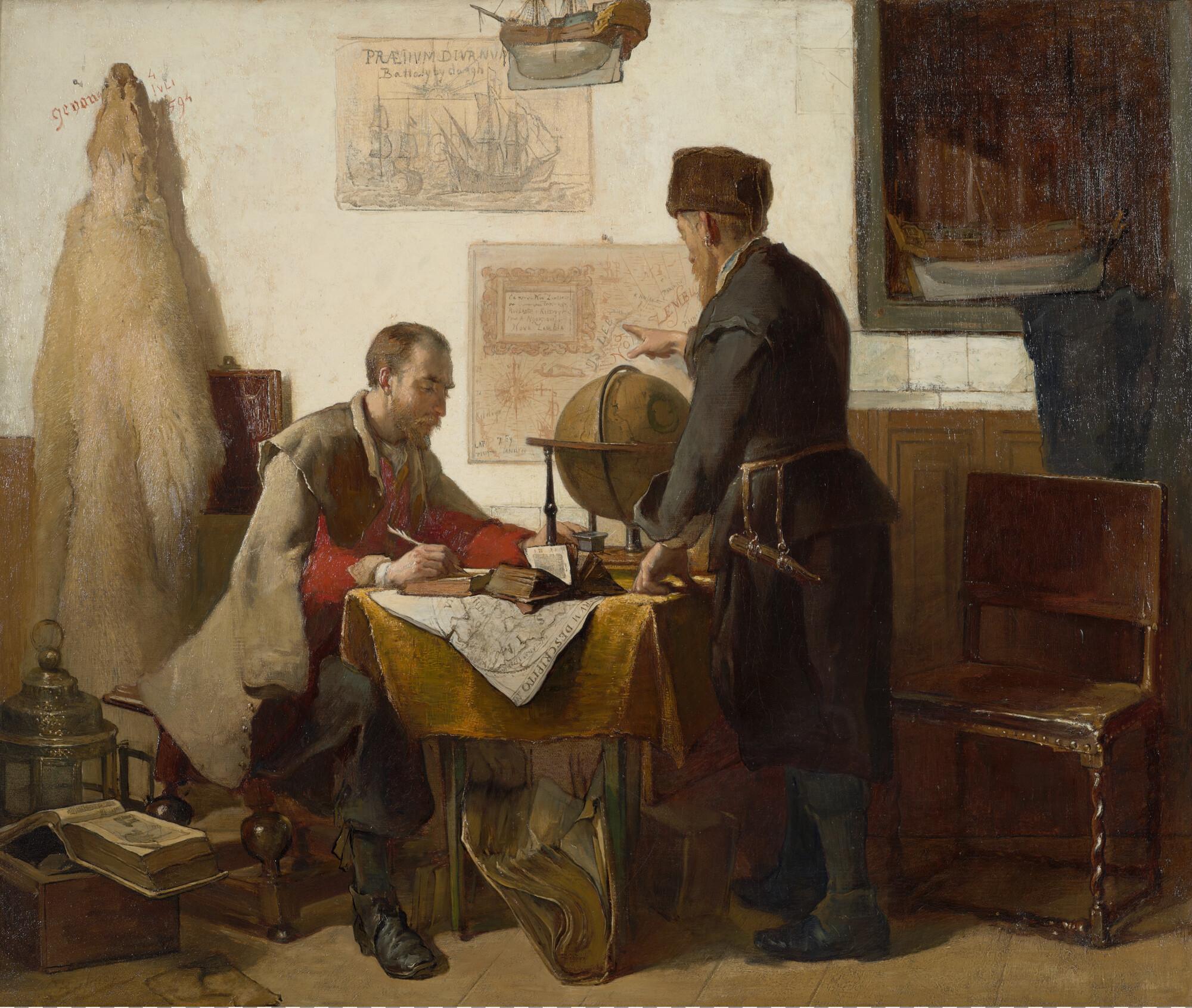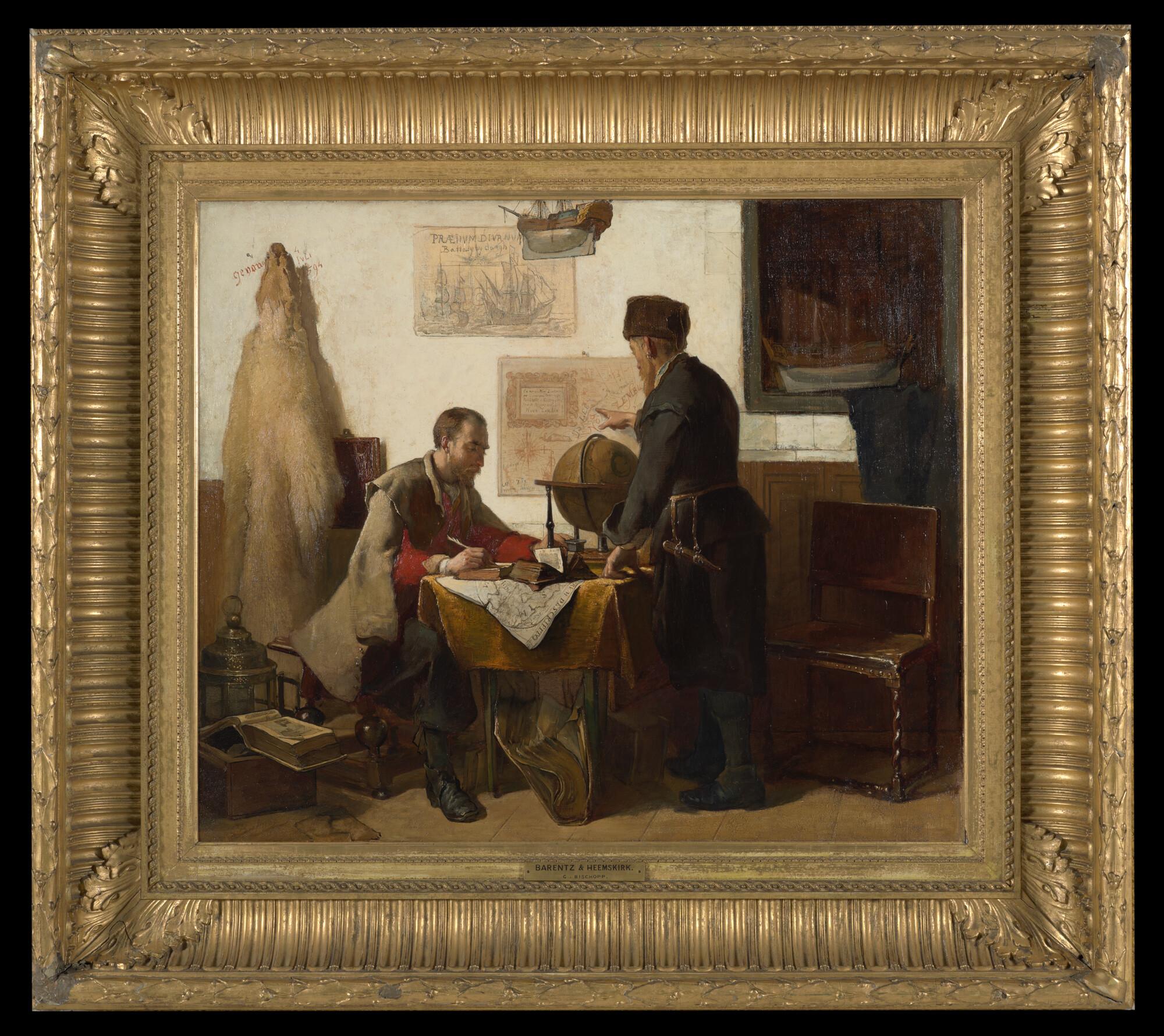 Heemskerck en Barends, in een interieur, bezig met de voorbereiding van hun tweede tocht naar het Noorden, 1595.