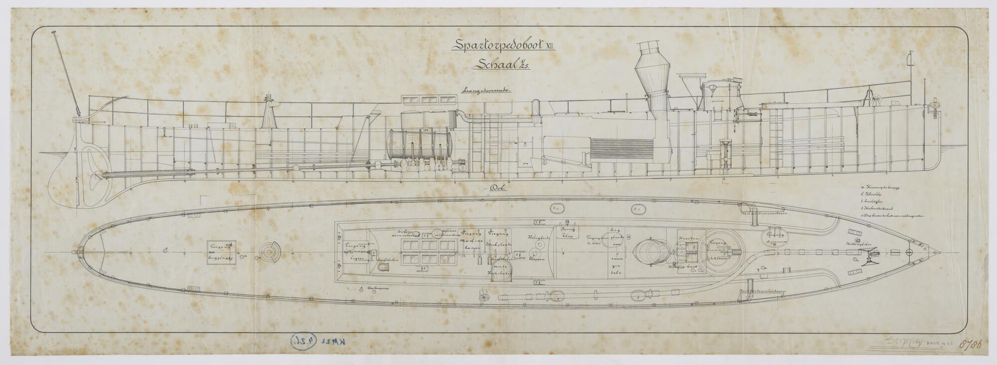 Horizontale en verticale langsdoorsnede aan boord van spartorpedoboot Zr.Ms. XII