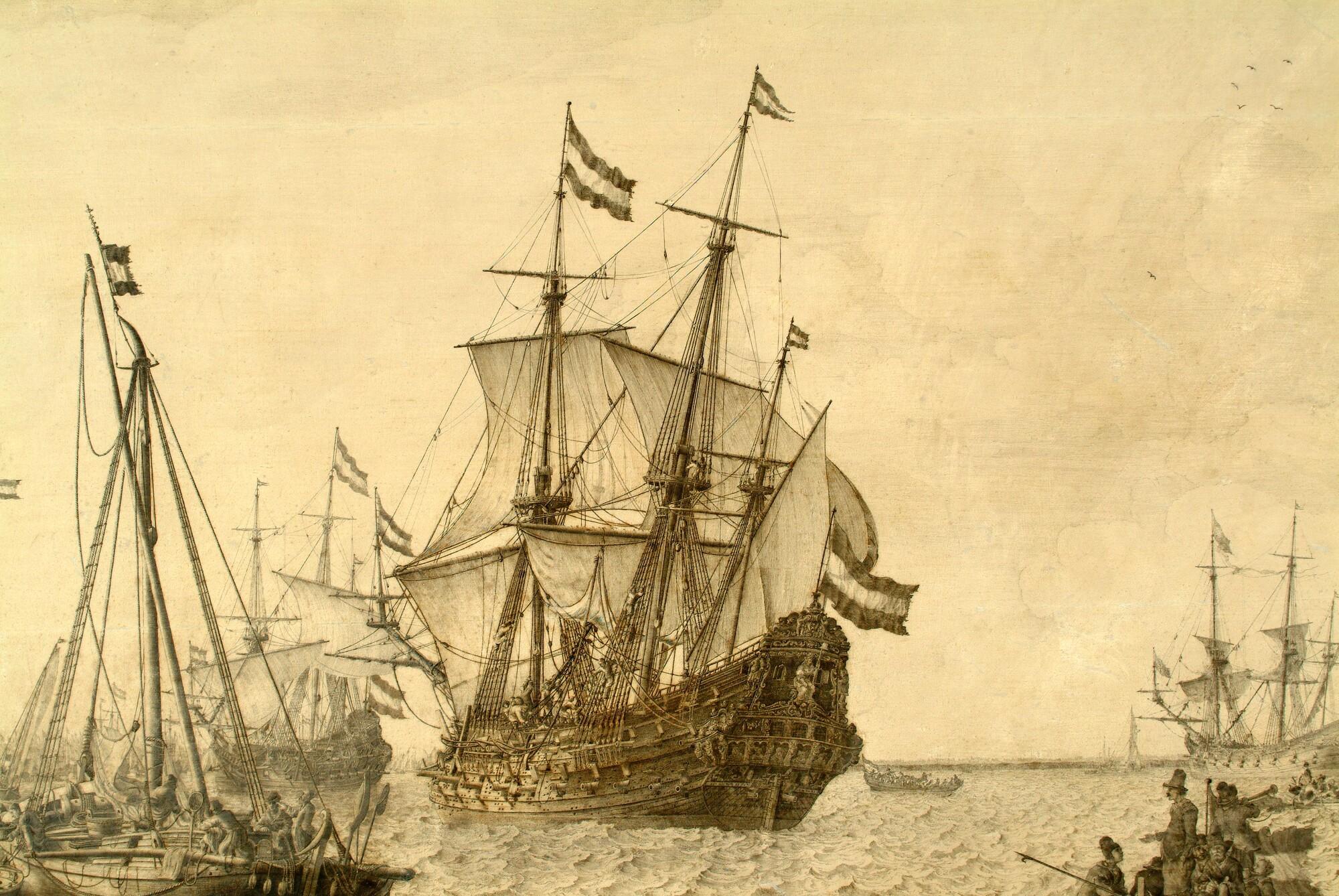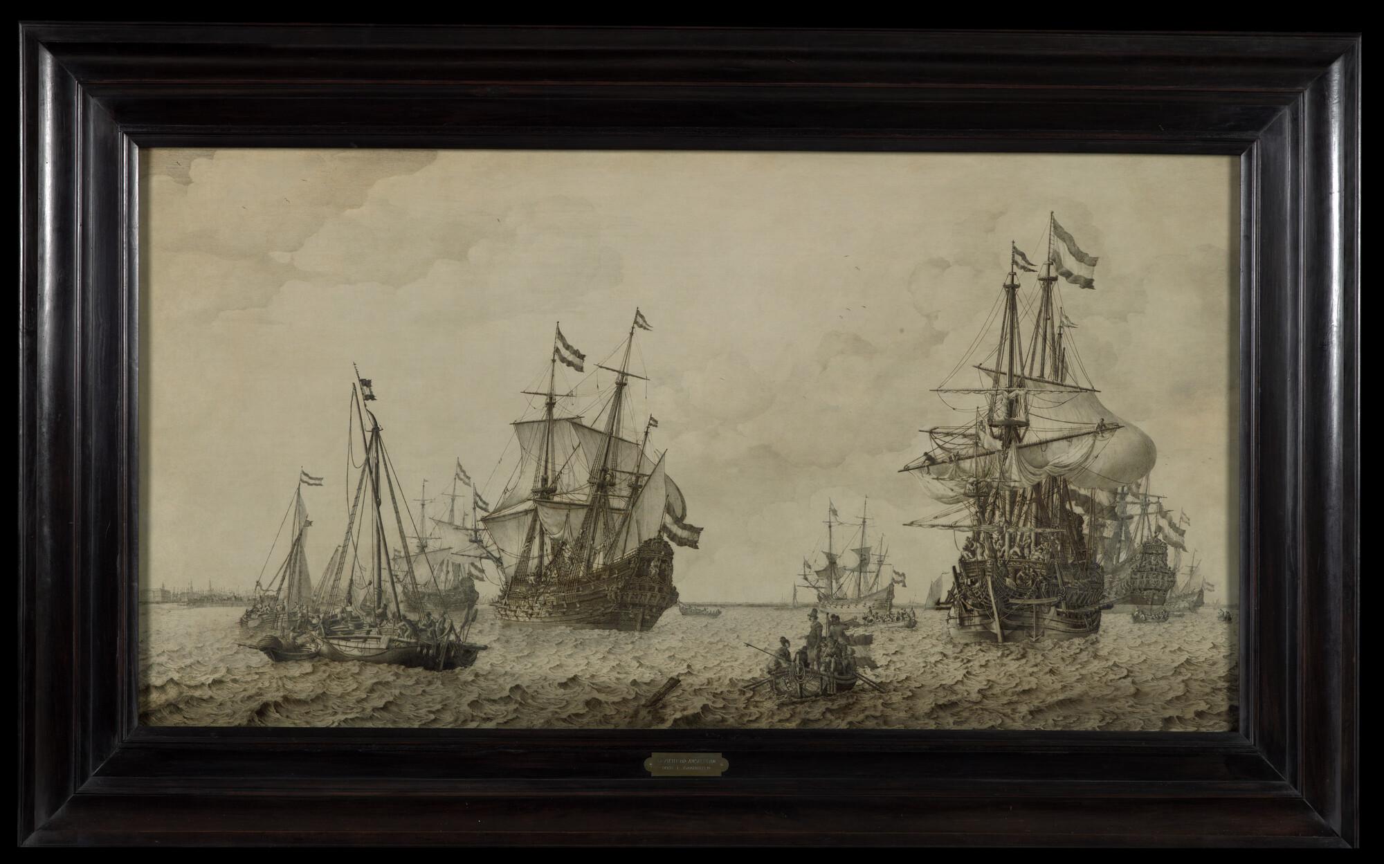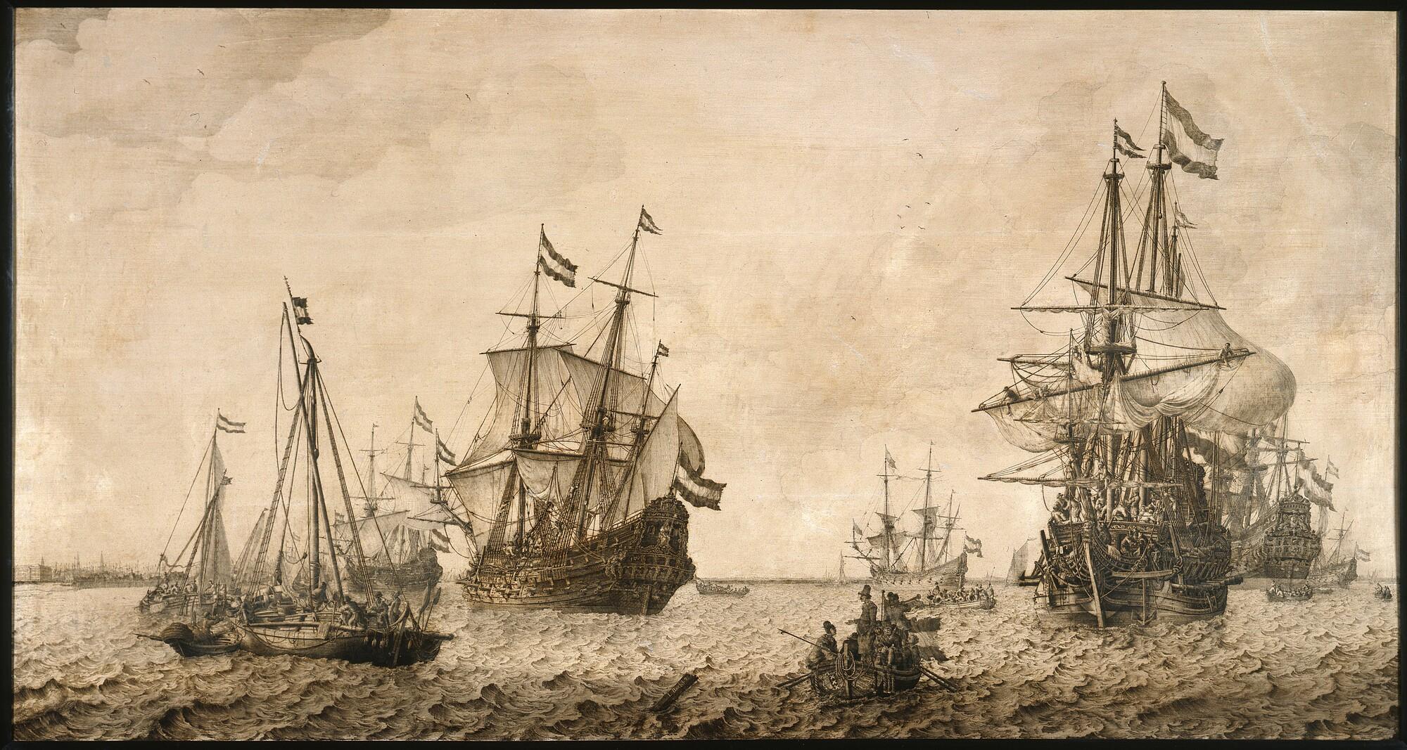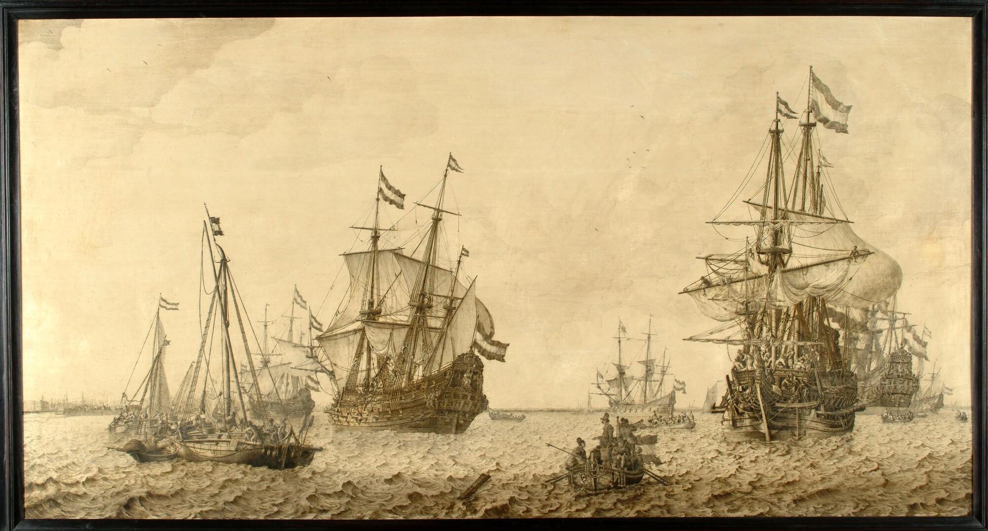 Schepen op de rede van Amsterdam, in het midden het oorlogsschip Vrijheid, rechts de Amsterdam. Geheel links op de achtergrond 's Lands Zeemagazijn.