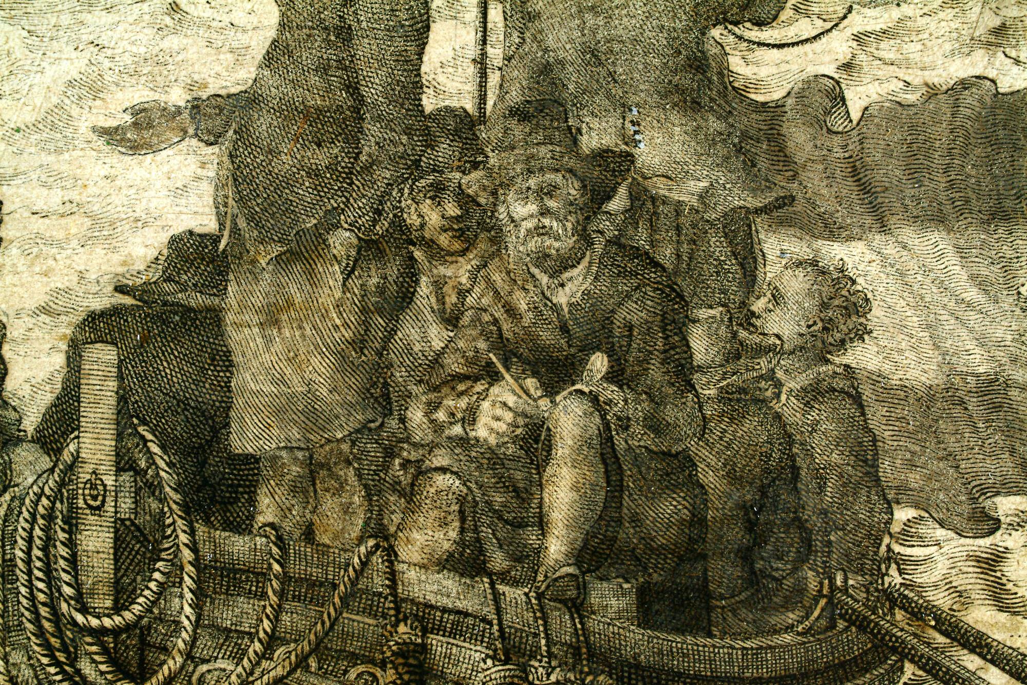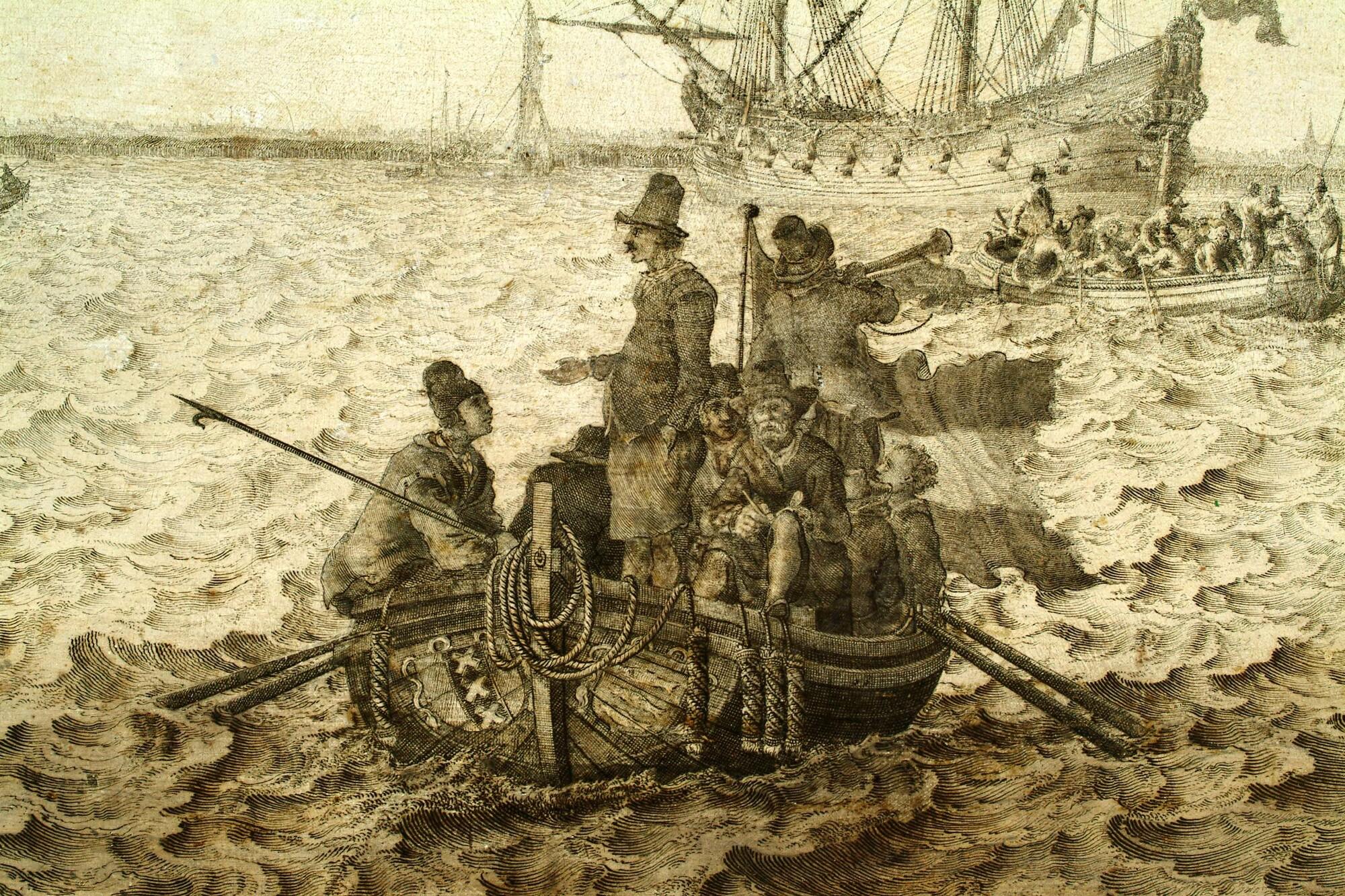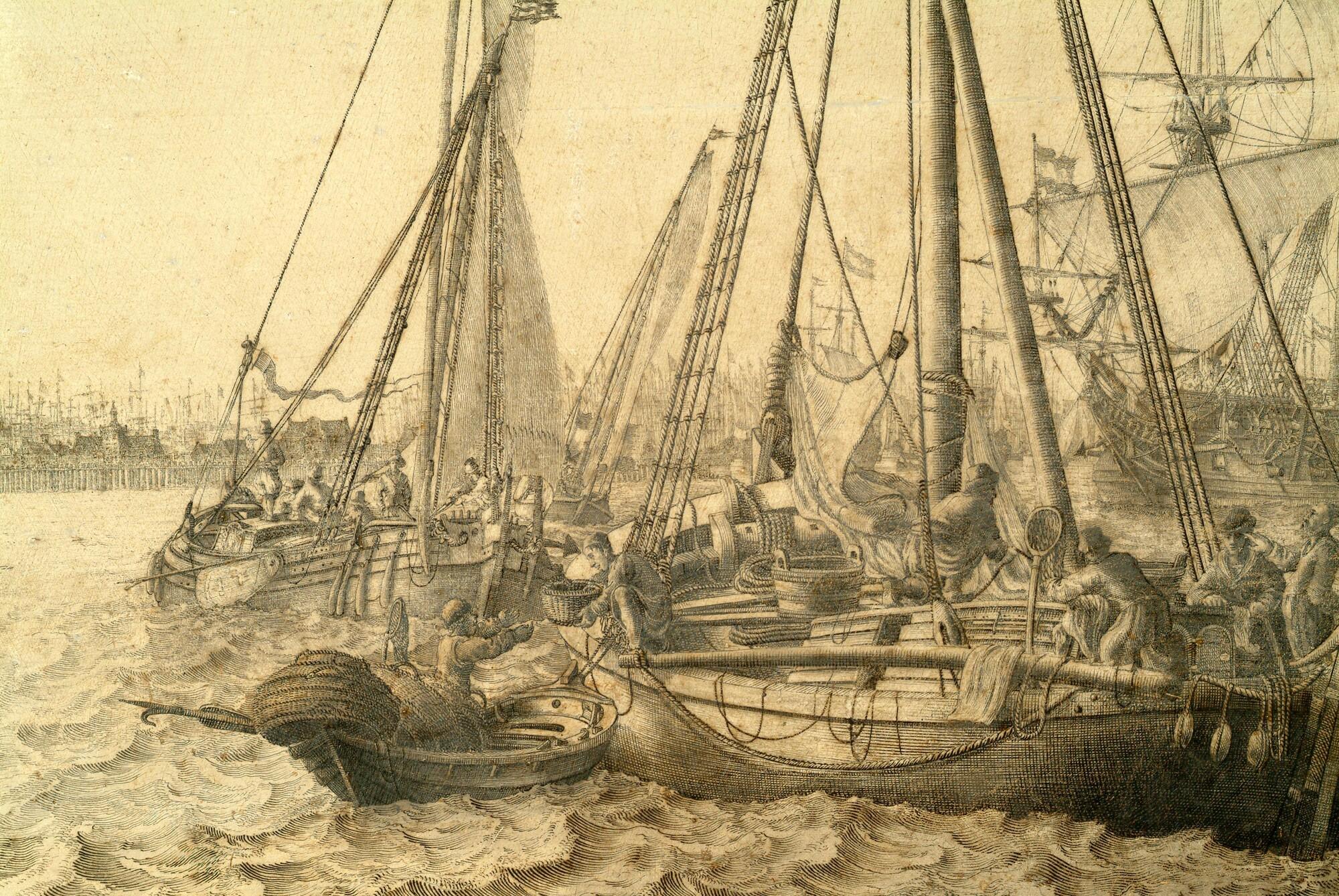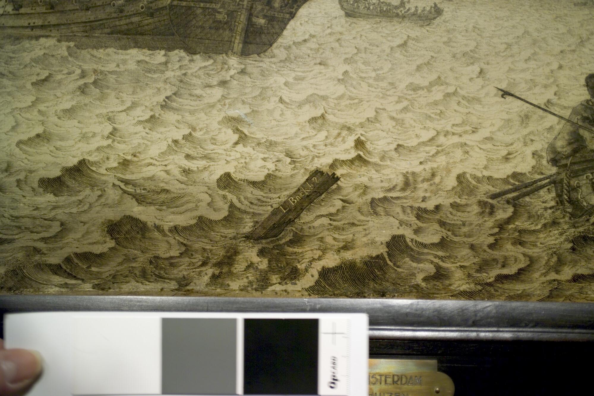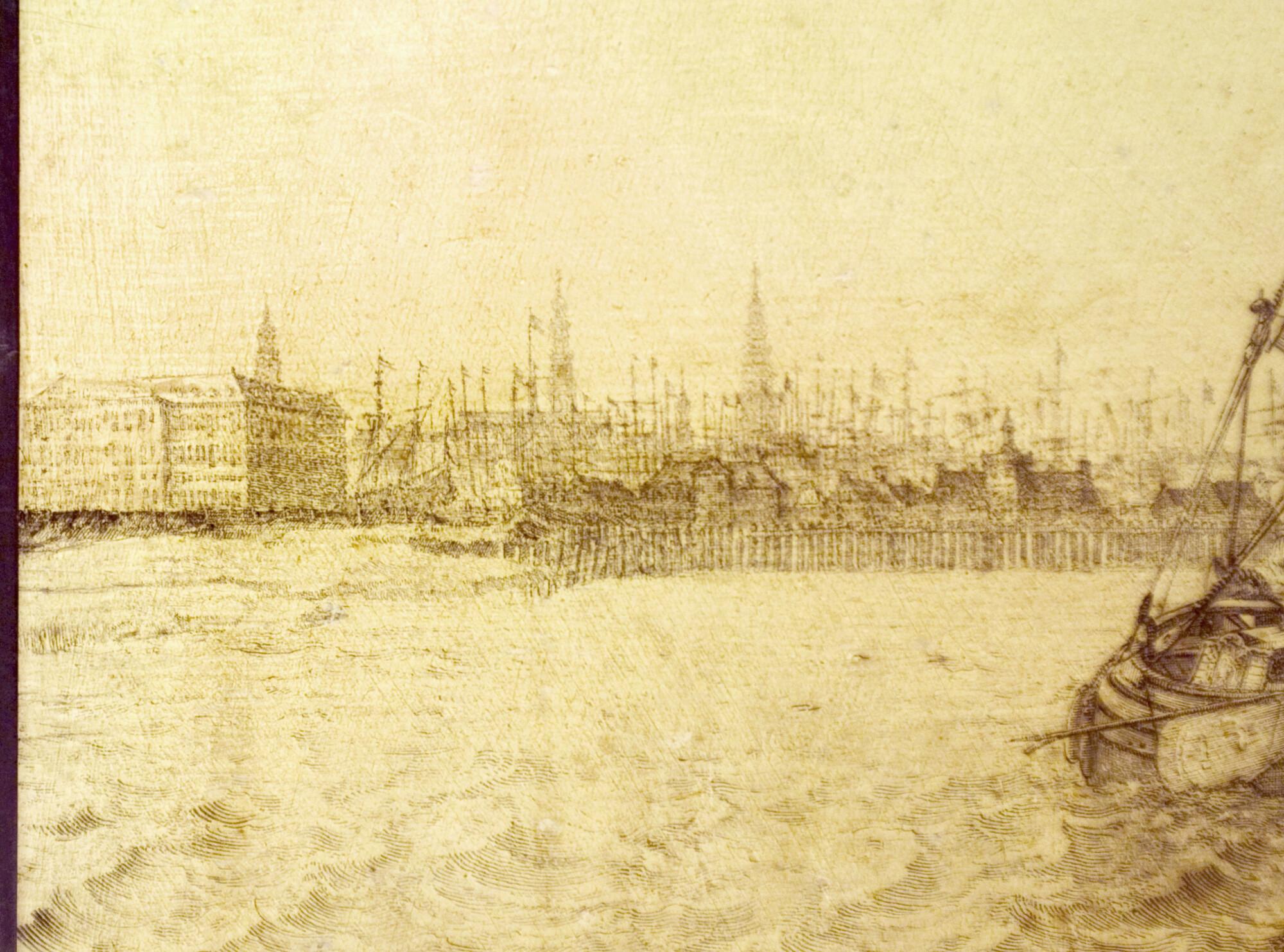 Schepen op de rede van Amsterdam, in het midden het oorlogsschip Vrijheid, rechts de Amsterdam. Geheel links op de achtergrond 's Lands Zeemagazijn.