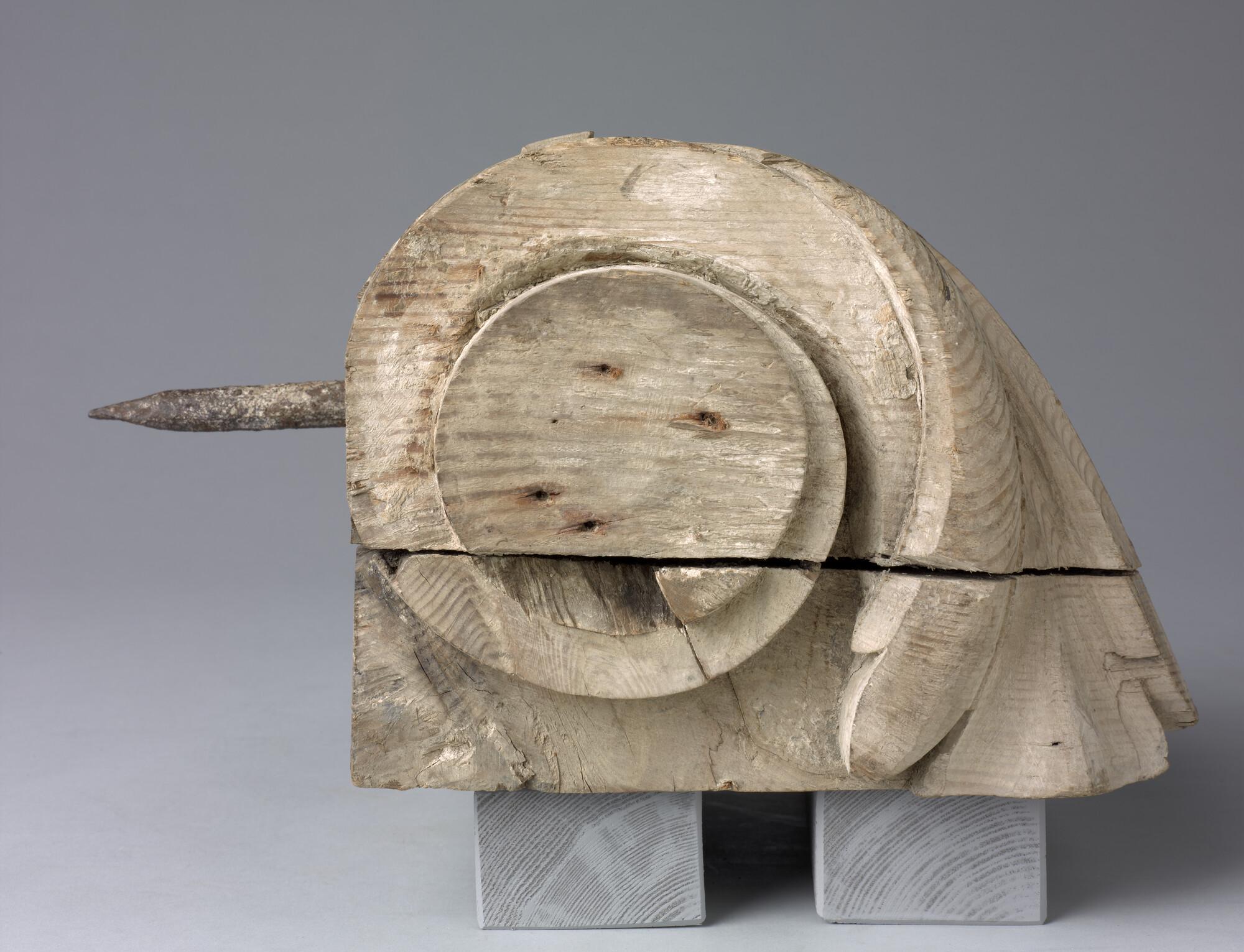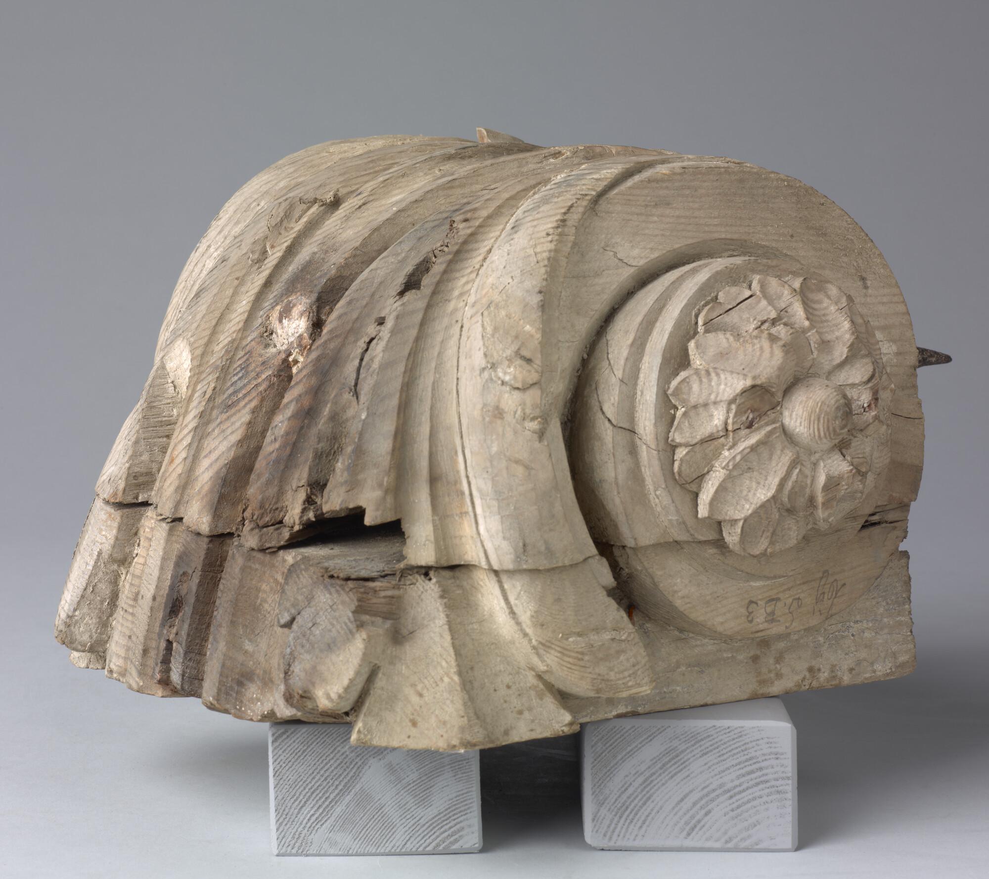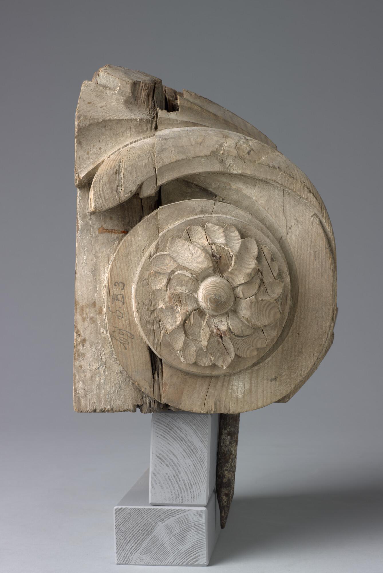 Deel van de console van de spiegelversiering met aan de voorkant c-voluten met in het midden een gestileerde bloem. Aan de achterkant groeven en gleuven. Aan de linker achterzijkant steekt een grote pen uit.