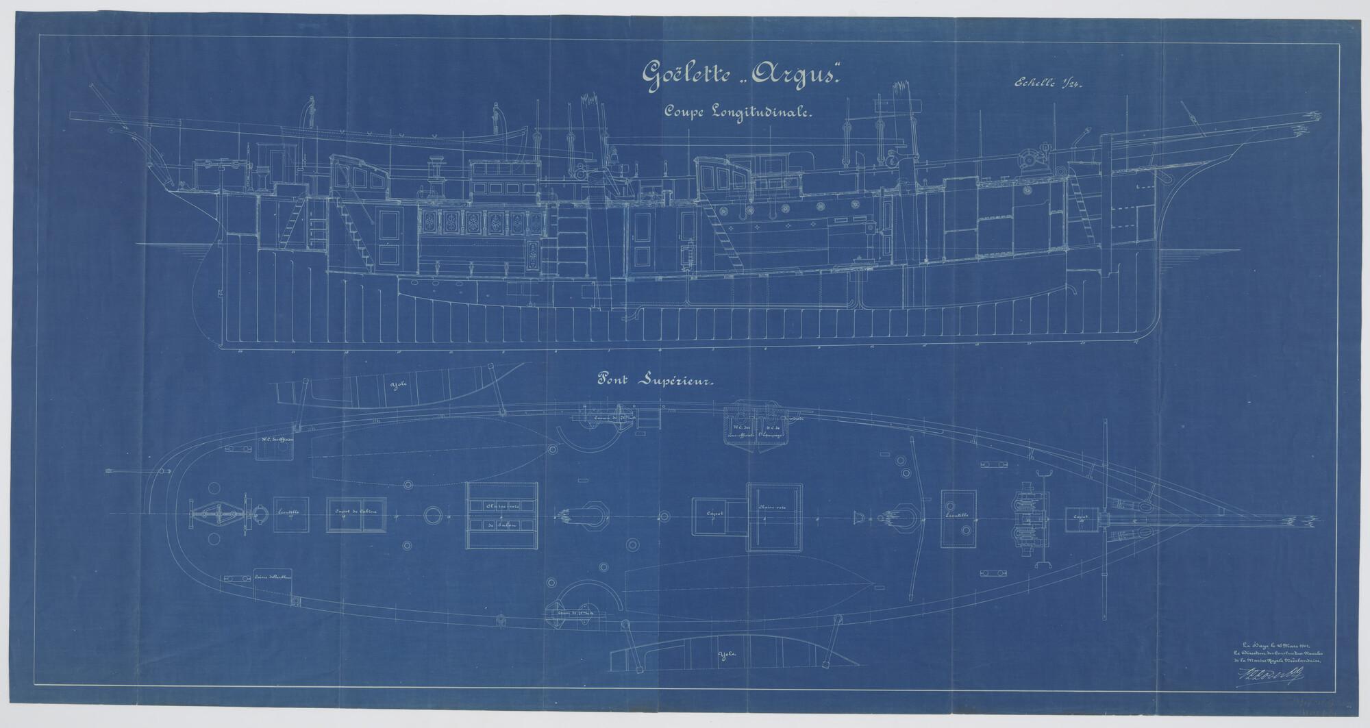 Langsdoorsnede ; bovenaanzicht bovendek aan boord van het stalen visserij inspectievaartuig, de gaffelzeilschoener Zr.Ms. 'Argus' . Betimmering salon ; ankerinrichting ; walvissloep ; grote loodsjol ; kompas ; stuurinrichting ; kanons 7.5cm (schaal 1:24).