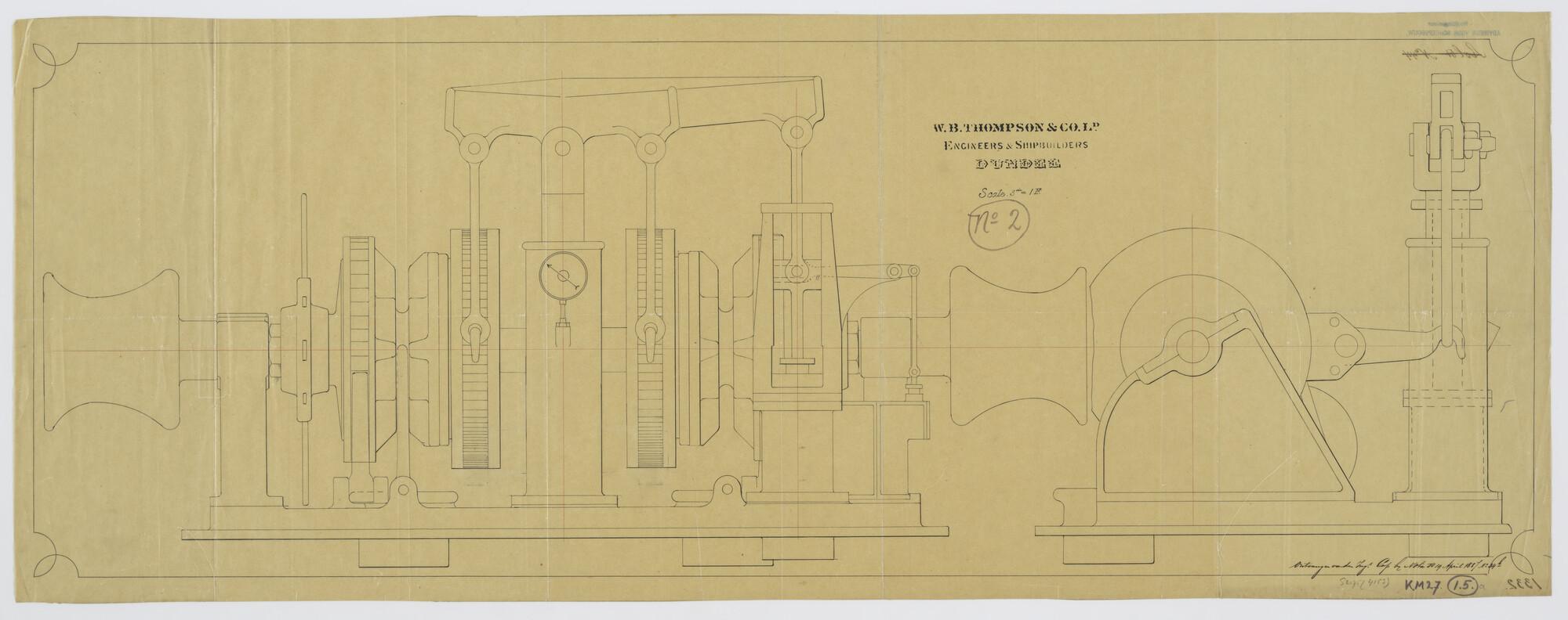 Langs- en dwarsdoorsnede van de pompspil aan boord van het stalen visserij inspectievaartuig, de gaffelzeilschoener Zr.Ms. 'Argus' (schaal 3"= 1 foot).