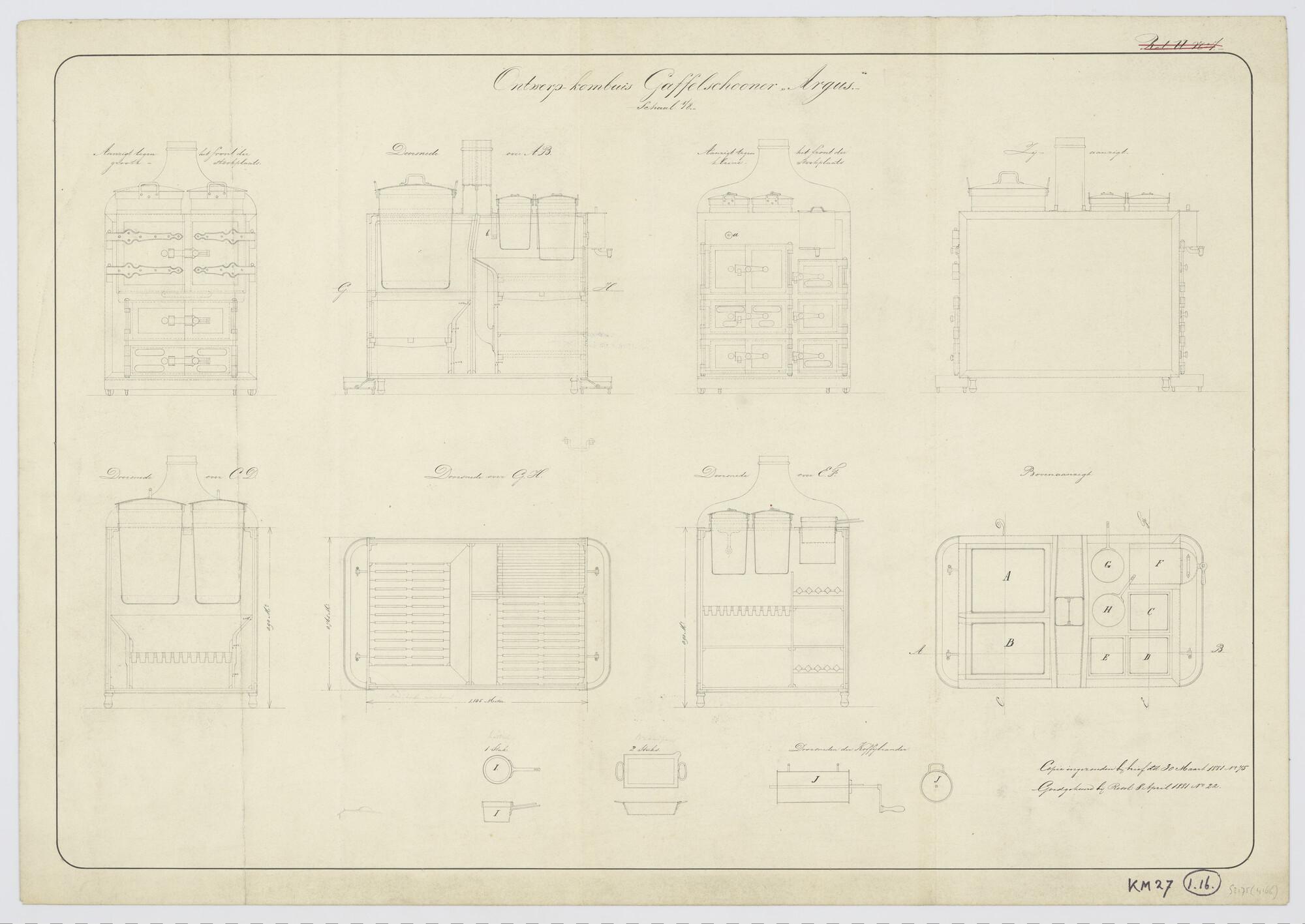 Diverse doorsneden en aanzichten van het kombuis aan boord van het stalen visserij inspectievaartuig, de gaffelzeilschoener Zr.Ms. 'Argus' . Aantallen en soorten gamellen ; koffiebrander (schaal 1:8).