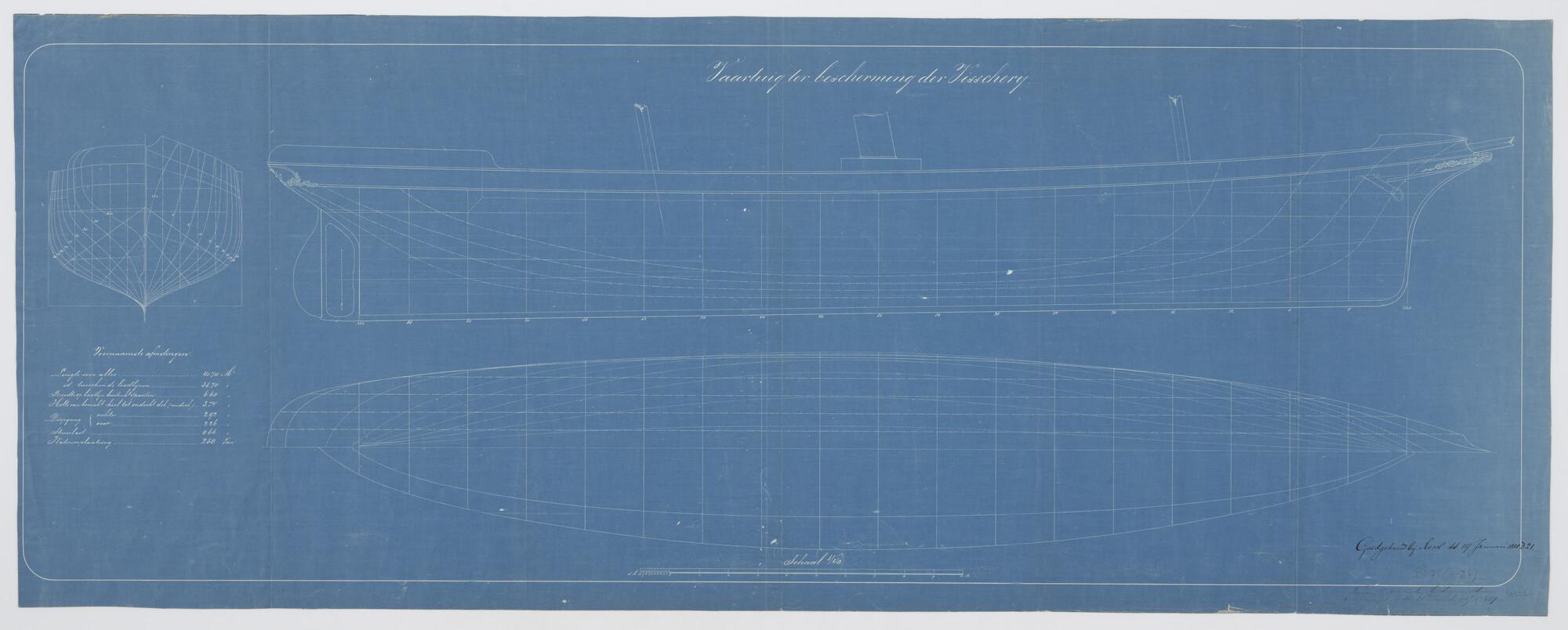 Lijnentekening ; spantenraam en overzicht van de voornaamste afmetingen van het visserij inspectievaartuig, de schoener Zr.Ms. 'Dolfijn'. Twee masten ; boegspriet ; schoorsteen ; scheepssier (schaal 1:40).