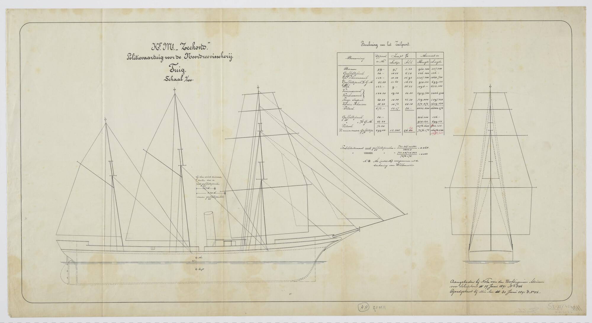 Zijaanzicht over SB-zijde alsmede het vooraanzicht met tuigage, het zeilplan en de berekening van het zeilpunt van het visserij inspectievaartuig, de schoener Hr.Ms. 'Zeehond'. Fokkemast ; grote mast ; bezaan. Gaffeltopzeilen ; bramzeilen ; marszeil ; stagzeilen ; schoenerzeil ; kluiver ; fok ; bezaanzeil ; (schaal 1:50).