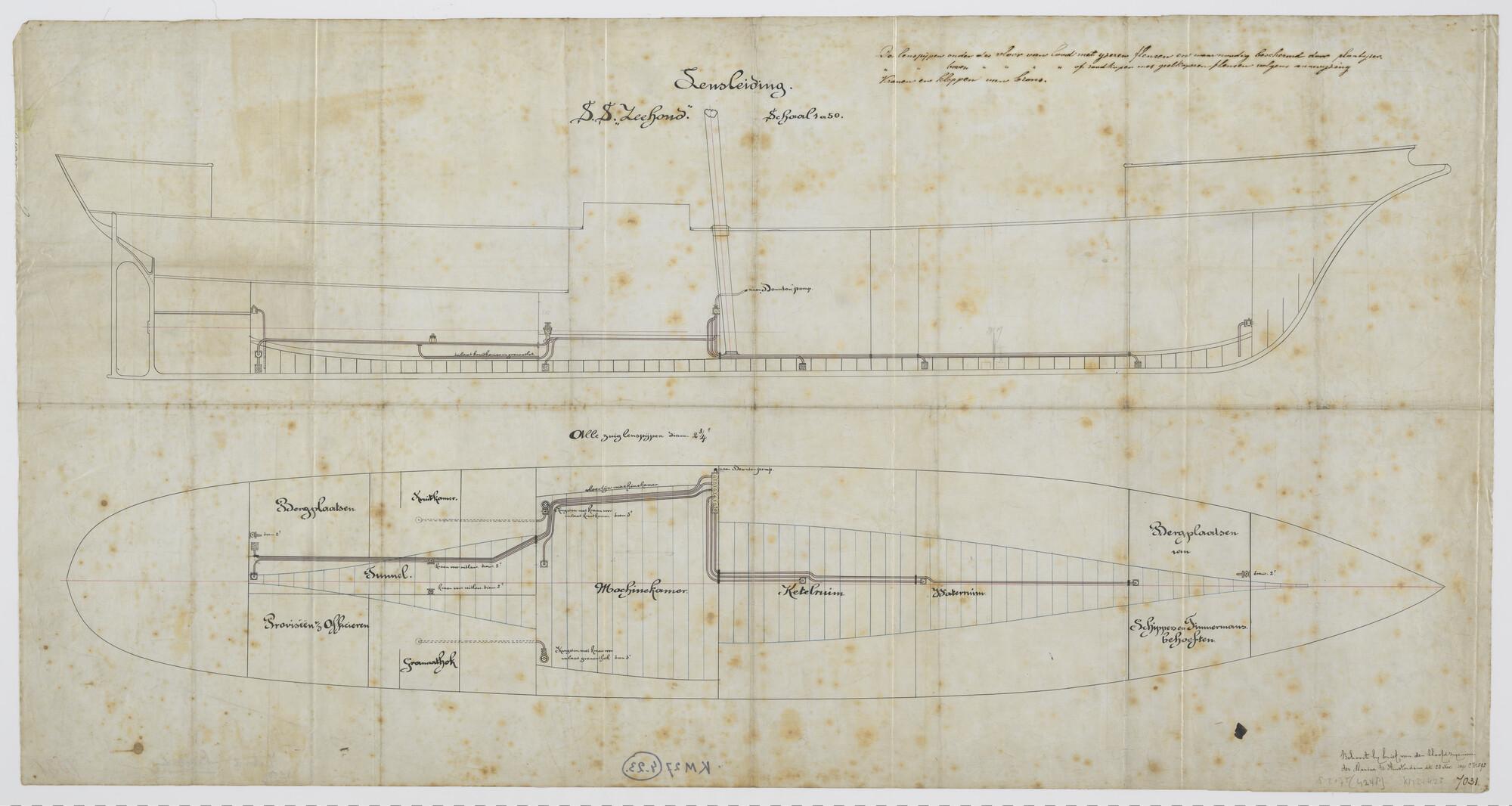 Langsdoorsnede en indeling van het ruim met lensleiding in de schroefastunnel ; de machinekamer ; het ketelruim en het waterruim aan boord van het visserij inspectievaartuig, de schoener Hr.Ms. 'Zeehond'. Kingstons ; kranen ; Dounton pomp (schaal 1:50).