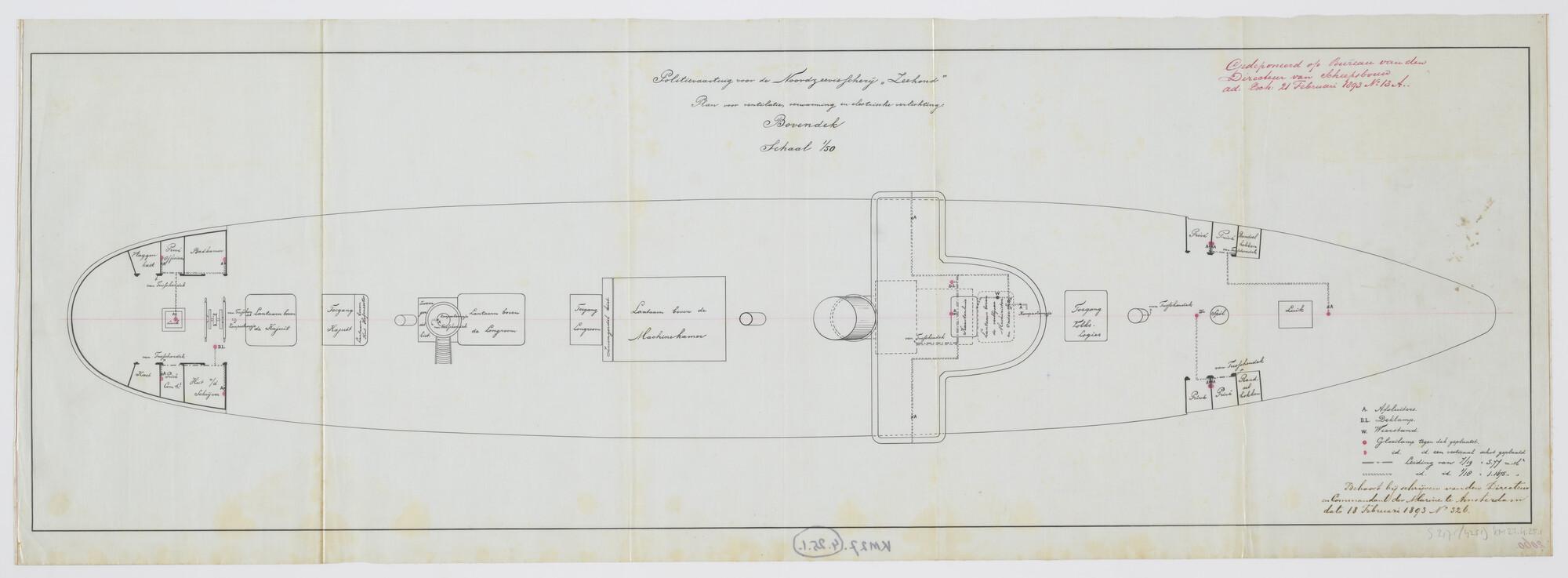 Bovenaanzicht van het bovendek met het plan tot ventilatie ; verwarming en verlichting aan boord van het visserij inspectievaartuig, de schoener Hr.Ms. 'Zeehond'. Deklampen ; afsluiters ; weerstanden ; gloeilampen. Navigatiebrug ; luiken ; toegangen ; lantaarns ; privé's ; zwemgordelkisten ; randselhokken (schaal 1:50).