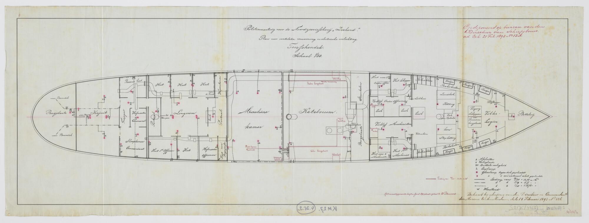 Bovenaanzicht van het tussendek met het plan tot ventilatie ; verwarming en verlichting aan boord van het visserij inspectievaartuig, de schoener Hr.Ms. 'Zeehond'. Afsluiters ; weerstanden ; gloeilampen ; looplampen ; veiligheden. Volkslogies ; accommodatie voor onderofficieren ; bergplaatsen ; ketelruim ; machinekamer ; hutten voor officieren ; longroom ; kajuit (schaal 1:50).