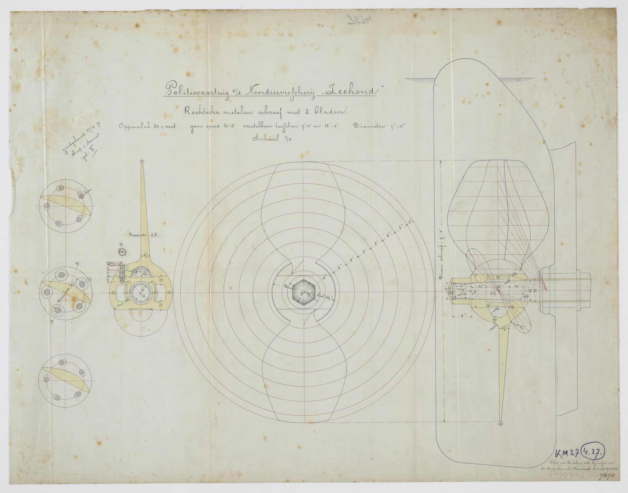 Langsdoorsnede en dwarsdoorsneden van de rechtsdraaiende metalen schroef met twee bladen aan boord van het visserij inspectievaartuig, de schoener Hr.Ms. 'Zeehond' (schaal 1:8).