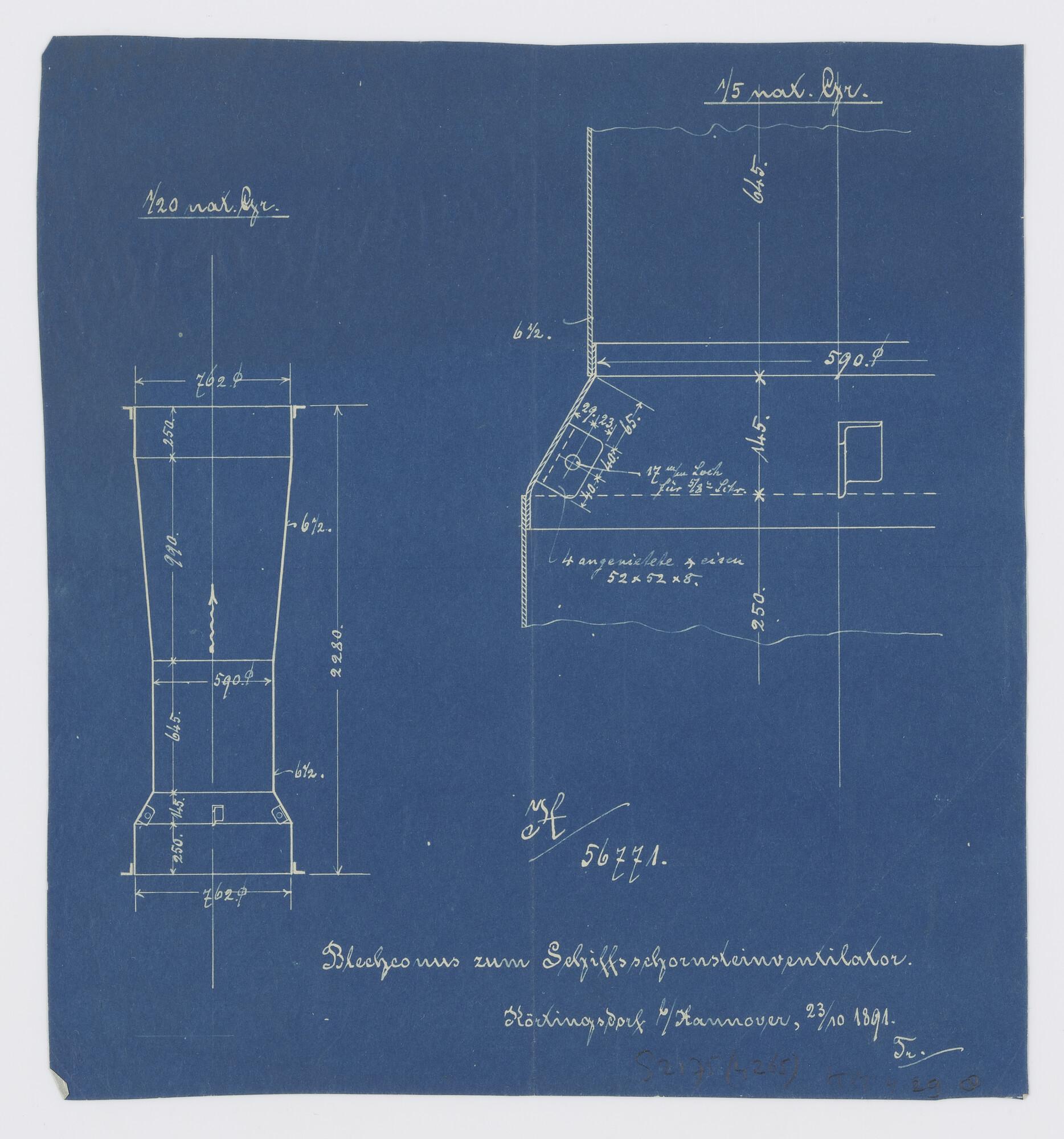 Doorsneden van de schoorsteen aan boord van het visserij inspectievaartuig, de schoener Hr.Ms. 'Zeehond' (schaal 1:20, 1:5).