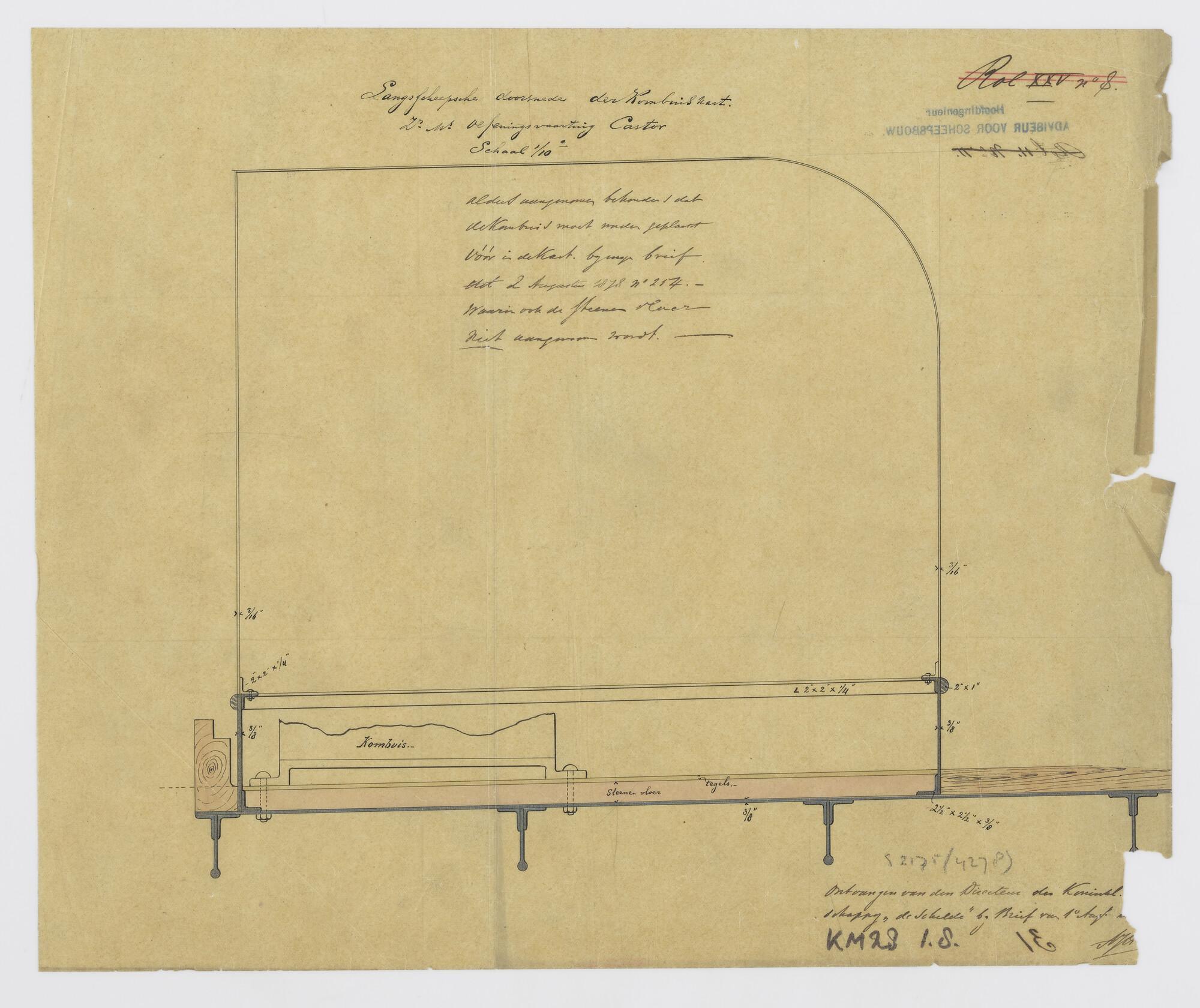 Langsdoorsnede van de kombuiskast met betegelde stenen vloer achter de fokkemast aan boord van het instructievaartuig, de brik Zr.Ms. 'Castor' (schaal 1:10).