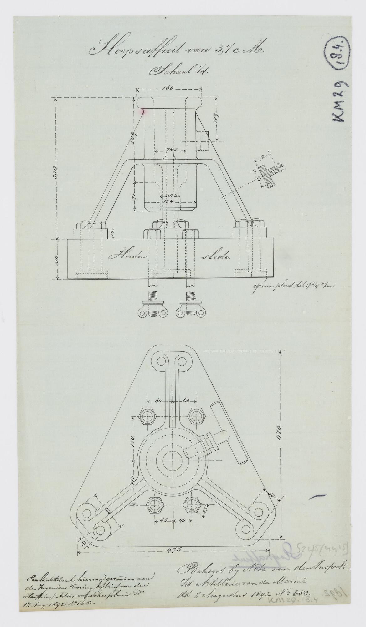 Sloepsaffuit voor een snelvuurkanon van 3.7 cm. Langs- en dwarsdoorsnede van een sloepsaffuit voor een snelvuurkanon (schaal 1:4).