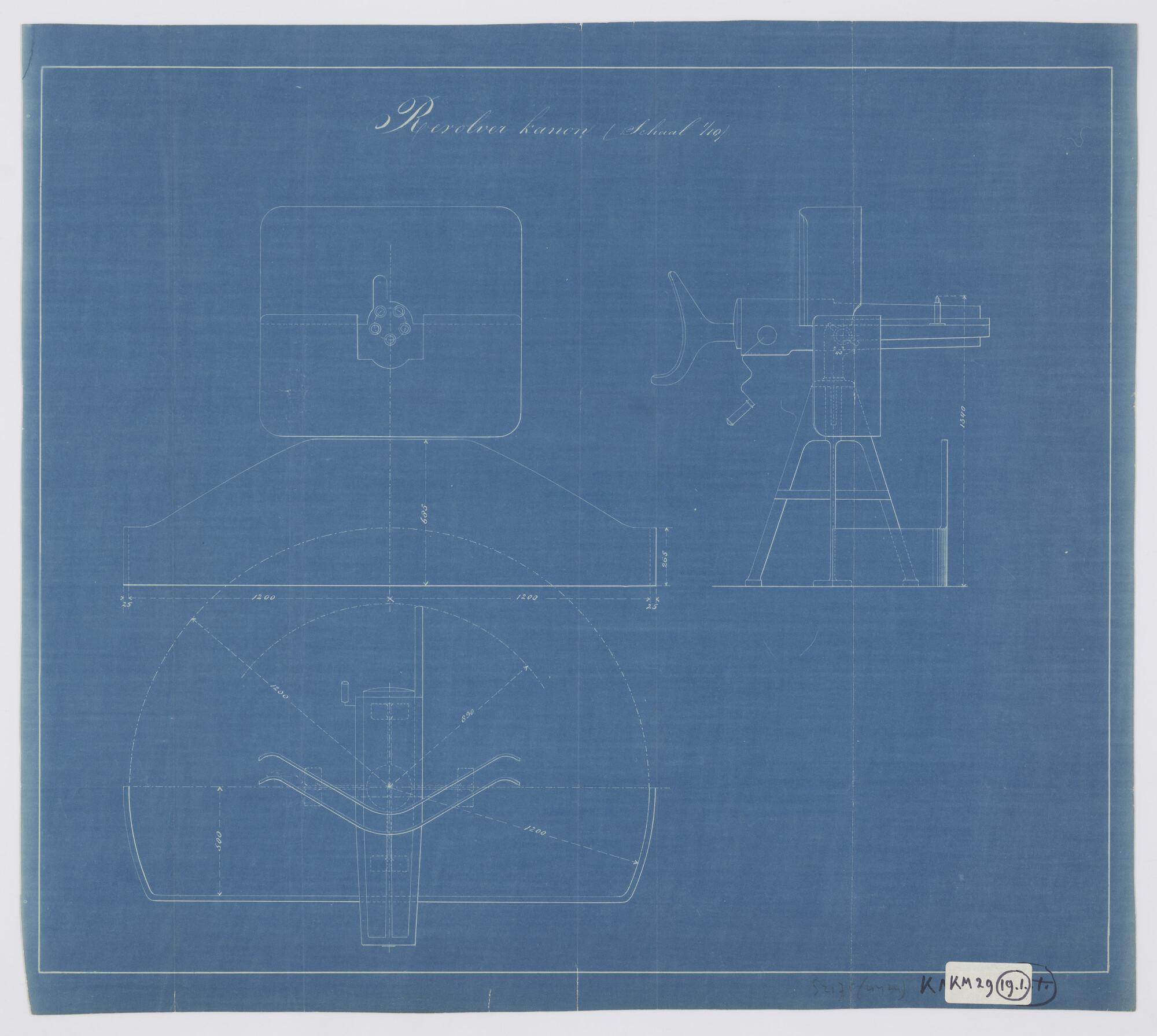 Horizontale en verticale langsdoorsnede en een dwarsdoorsnede van het revolverkanon (schaal 1:10).