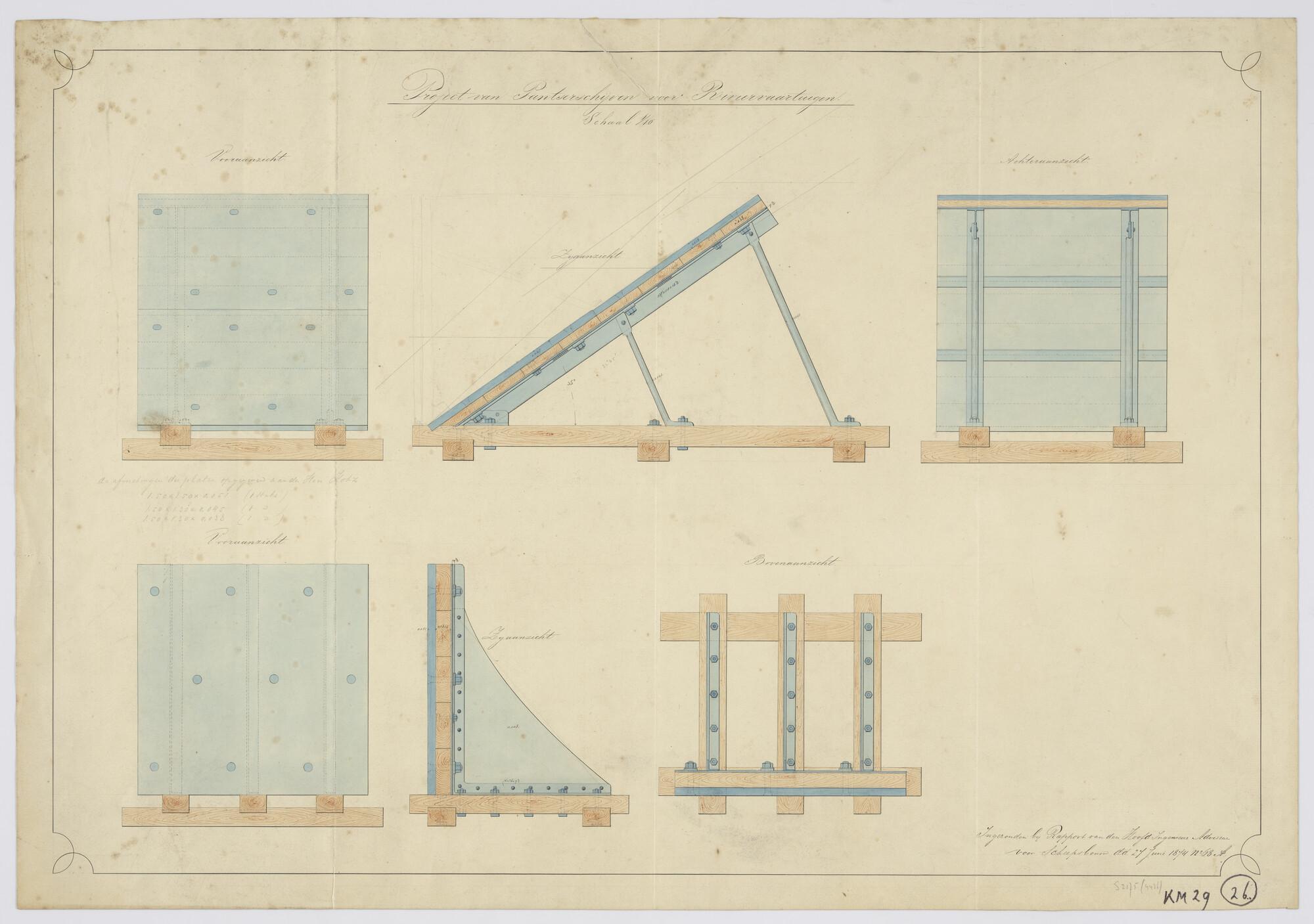 Diverse doorsneden en aanzichten van het project voor schietschijven op de rivieren ten behoeve van de gepantserde riviervaartuigen (schaal 1:10).