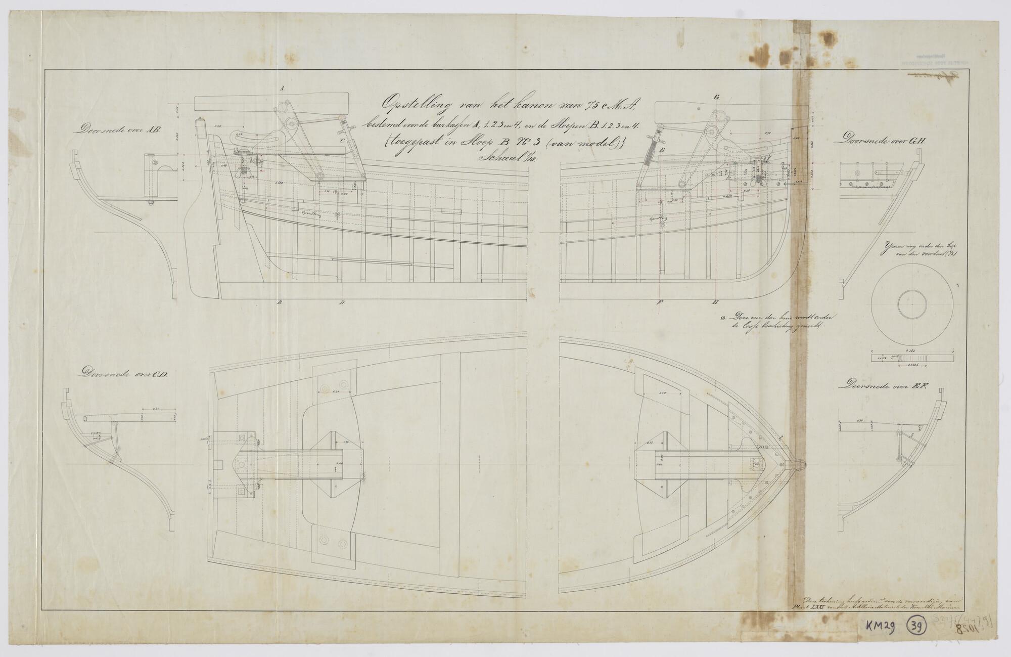 Opstelling kanon 7.5 cm A. in sloep B3. Verticale en horizontale langsdoorsnede en dwarsdoorsneden van een sloep B3 met op de voorplecht en achterplecht een kanon 7.5 cm A. Kanon bestemd voor de barkassen A1, A2, A3 en A4; en voor de sloepen B1, B2, B3 en B4 (schaal 1:10).