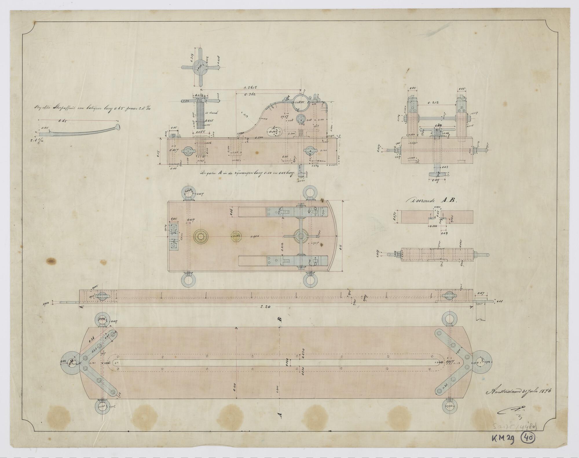 Sloepsaffuit tot getrokken kanon 7 cm. Verticale en horizontale langsdoorsnede en dwarsdoorsneden van een sloepsaffuit tot getrokken kanon 7 cm.